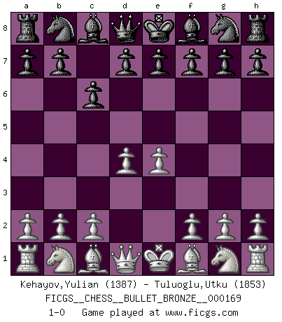 Last move : 1-0 2010 January 30 18:14:31 [Event "FICGS__CHESS__BULLET_BRONZE__000169"] [Site "FICGS"] [Date "2010.01.30"] [Round "1"] [White "Kehayov,Yulian"] [Black "Tuluoglu,Utku"] [Result "1-0"] [WhiteElo "1387"] [BlackElo "1853"] 1.e4 c6 2.d4 1-0 This chess game has been lost on time (started : 2010.01.30 17:4:57) Caro-Kann defense Player White won this chess game. Follow this game move after move (download)First-class players lose to second class players because second-class players sometimes play a first-class game. (Tarrasch) Ich hatte meine größten Erfolge, als ich 47 Jahre alt war. Kasparow war noch nicht mal 42 und hat das Schach schon im Stich gelassen. (Viktor Kortschnoi) Los tropiezos estan todos ahí en el tablero, esperando que se cometan. (Savielly Tartakover) Les ravages du H expliquent la différence de niveau entre Tal et Thal [Abergel]. To send light into the darkness of men's hearts - such is the duty of the artist. (Schumann)