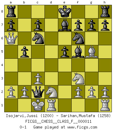 Last move : 0-1 2006 October 18 16:8:12 [Event "FICGS__CHESS__CLASS_F__000011"] [Site "FICGS"] [Date "2006.09.09"] [Round "1"] [White "Isojarvi,Jussi"] [Black "Sarihan,Mustafa"] [Result "0-1"] [WhiteElo "1200"] [BlackElo "1258"] 1.c3 e5 2.e4 Nf6 3.d3 d5 4.Bg5 dxe4 5.Nd2 exd3 6.Bxd3 Qxd3 7.Qb3 Be7 8.O-O-O Bf5 9.Ngf3 Nc6 10.Qa4 b5 11.Qa6 Qc2+ 0-1 Saragossa Opening Queenside Castling by player White (move 8) Player Black won this chess game. Follow this game move after move (download)What is the difference between chess and football? Everybody understands football, but nobody plays it. Everybody plays chess, but nobody understands it. Everything is relative. (Vladimir Kramnik) Ich habe die Schachforschung dermaßen betrieben, dass sie auf eine wissenschaftliche Basis gestellt wurde. (Mikhail Moiseyevich Botvinik) Cuando me preguntan: -¿Cual es el secreto que te hace hacer mejores movidas que tus oponentes?, Yo respondo: Me da gusto que me pregunten eso, porque, como veran, hay una simple razón. Yo pienso mis propias movidas y dejo a mi oponente que el piense las suyas. (Alexander Alekhine) Aucun coup ne doit être joué sans but. (Pedro Damiano) Those parts of the system that you can hit with a hammer (not advised) are called hardware; those program instructions that you can only curse at are called software. (Anonymous)