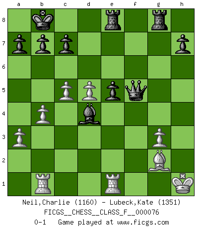 Last move : 0-1 2009 June 2 18:35:58 [Event "FICGS__CHESS__CLASS_F__000076"] [Site "FICGS"] [Date "2009.04.20"] [Round "1"] [White "Neil,Charlie"] [Black "Lubeck,Kate"] [Result "0-1"] [WhiteElo "1160"] [BlackElo "1351"] 1.c4 d6 2.g3 e5 3.Bg2 Bd7 4.Nc3 Nc6 5.d3 Qf6 6.e4 d5 7.Nge2 Bc5 8.O-O Nh6 9.Nxd5 Qd8 10.Nec3 Nb4 11.a3 Nxd5 12.exd5 Qf6 13.Ne4 Qb6 14.Qh5 O-O-O 15.b4 Bd4 16.Rb1 f5 17.Bxh6 gxh6 18.c5 Qb5 19.Nf6 Rdf8 20.Nxd7 Kxd7 21.Qxh6 Qxd3 22.Qg7+ Kc8 23.Rfd1 Qe2 24.Rf1 f4 25.Qe7 Re8 26.Qg5 Rhg8 27.Qf5+ Kb8 28.Rfe1 Qxf2+ 29.Kh1 fxg3 30.hxg3 Qxf5 0-1 English Opening Kingside Castling by player White (move 8) Queenside Castling by player Black (move 14) Player Black won this chess game. Follow this game move after move (download)Chess is the gymnasium of the mind. (Blaise Pascal) Jeder Schachmeister war einmal ein Anfänger. (Irving Chernev) La señal de un Gran Maestro es su habilidad de ganar una partida rápidamente y sin dolor. (Irving Chernev) La solitude du joueur d'Echecs à l'approche du mat est semblable à celle du condamné. (Francis Szpiner) Either move or be moved. (Ezra Pound)