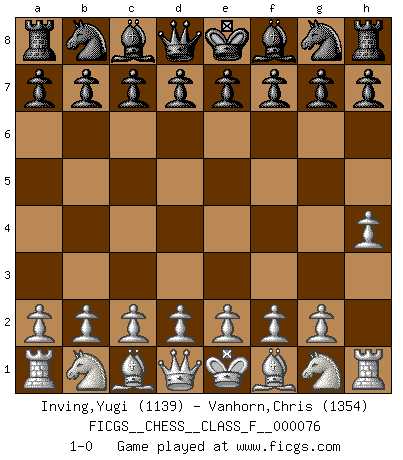 Last move : 1-0 2009 June 2 7:0:42 [Event "FICGS__CHESS__CLASS_F__000076"] [Site "FICGS"] [Date "2009.04.20"] [Round "1"] [White "Inving,Yugi"] [Black "Vanhorn,Chris"] [Result "1-0"] [WhiteElo "1139"] [BlackElo "1354"] 1.h4 1-0 This chess game has been lost on time (started : 2009.04.20 19:40:41) Anti-Borg (Desprez) Opening Player White won this chess game. Follow this game move after move (download)Chess is thirty to forty percent psychology. You don't have this when you play a computer. I can't confuse it. (Judith Polgar) Spielt Blackmar-Diemer-Gambit, und das Matt kommt von selbst! (Emil Joseph Diemer) No solamente yo pronostico su triunfo sobre Botvinnik, sino que me adelanto y digo que probablemente Fischer es el jugador de Ajedrez mas grande que haya existido. (John Collins) À la honte des hommes, on sait que les lois du jeu sont les seules qui soient partout justes, claires, inviolables et exécutées. Pourquoi l'Indien qui a donné les règles du jeu d'échecs est-il obéi de bon gré dans toute la terre, et que les décrétales des papes, par exemple, sont aujourd'hui un objet d'horreur et de mépris ? C'est que l'inventeur des échecs combina tout avec justesse pour la satisfaction des joueurs, et que les papes, dans leurs décrétales, n'eurent en vue que leur seul avantage. L'Indien voulut exercer également l'esprit des hommes et leur donner du plaisir; les papes ont voulu abrutir l'esprit des hommes. Voltaire (Dictionnaire philosophique / Garnier 1967) If we don't succeed, we run the risk of failure. (George W. Bush)