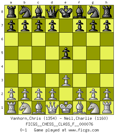 Last move : 0-1 2009 June 1 18:57:12 [Event "FICGS__CHESS__CLASS_F__000076"] [Site "FICGS"] [Date "2009.04.20"] [Round "1"] [White "Vanhorn,Chris"] [Black "Neil,Charlie"] [Result "0-1"] [WhiteElo "1354"] [BlackElo "1160"] 1.e3 e5 0-1 This chess game has been lost on time (started : 2009.04.20 19:40:41) Van't Kruijs Opening Player Black won this chess game. Follow this game move after move (download)The only thing Chess players have in common is Chess. (Lodewijk Prins) Die FIDE ist dabei in die Hände der russischen Mafia zu fallen. (Larry Evans) No existe un remordimiento como el remordimiento del Ajedrez. (H. G. Wells) Les sacrifices démontrent seulement que quelqu'un a gaffé. (Savielly Tartacover) When the going gets tactical, the computers get going. (Hyatt)