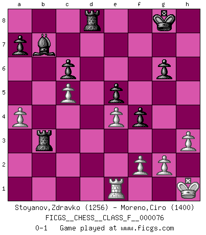 Last move : 0-1 2009 May 2 8:52:44 [Event "FICGS__CHESS__CLASS_F__000076"] [Site "FICGS"] [Date "2009.04.20"] [Round "1"] [White "Stoyanov,Zdravko"] [Black "Moreno,Ciro"] [Result "0-1"] [WhiteElo "1256"] [BlackElo "1400"] 1.e4 c5 2.Nf3 Nc6 3.Bb5 d6 4.Bxc6+ bxc6 5.h3 g6 6.O-O Bg7 7.c3 Nf6 8.Qa4 Qc7 9.Re1 O-O 10.d3 Nd7 11.Bf4 Rb8 12.b3 e5 13.Be3 Nb6 14.Qa3 f5 15.Nbd2 f4 16.Bxc5 dxc5 17.Qxc5 Be6 18.Ng5 Rfe8 19.Ndf3 Bc8 20.a4 Bf8 21.Qa5 h6 22.c4 Nd5 23.Qd2 Bb4 24.Qc1 Nc3 25.Qd2 hxg5 26.Nxg5 Qd6 27.Qc2 Bb7 28.Rec1 Rbd8 29.Nf3 Qxd3 30.Qxd3 Rxd3 31.Ne1 Ne2+ 32.Kh1 Nxc1 33.Rxc1 Bxe1 34.Rxe1 Rxb3 35.c5 Rd8 0-1 Sicilian : Nimzovich-Rossolimo attack (without ...d6) Kingside Castling by player White (move 6) Kingside Castling by player Black (move 9) Player Black won this chess game. Follow this game move after move (download)Chess holds its master in its own bonds, shackling the mind and brain so that the inner freedom of the very strongest must suffer. (Albert Einstein) Wie kann ich Remis annehmen? Ich weiß ja gar nicht, wie ich stehe! (Fritz Sämisch) El Ajedrez es el juego mas altamente simbólico, pero las agresiones estan por lo tanto aún mas francamente representadas en la partida. Tal vez comenzo como un juego de guerra; Algo como la representación de una batalla en miniatura entre las fuerzas de dos reinos. (Karl Meninger) Le joueur d'Echecs qui veut atteindre le top est obligé de développer son propre credo créatif. Alexeï Stepanovicth Souétine. Il est facile d'écrire des livres ! Ce qui est difficile, c'est de jouer ! (Alexeï Stepanovicth Souétine) I live to kill Traxler counterattack. (Ilmars Cirulis)