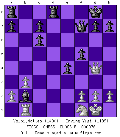 Last move : 0-1 2009 August 25 21:25:53 [Event "FICGS__CHESS__CLASS_F__000076"] [Site "FICGS"] [Date "2009.04.20"] [Round "1"] [White "Volpi,Matteo"] [Black "Inving,Yugi"] [Result "0-1"] [WhiteElo "1400"] [BlackElo "1139"] 1.e4 e5 2.Nf3 Nc6 3.Nc3 Nf6 4.Bc4 Nxe4 5.Nxe4 d5 6.Bb5 dxe4 7.Nxe5 Qd5 8.Bxc6+ bxc6 9.d4 f6 10.Ng4 Bd6 11.Ne3 Qf7 12.O-O O-O 13.c4 Rd8 14.c5 Bxc5 15.b3 Bxd4 16.Bb2 Ba6 17.Qg4 Bxb2 18.Rab1 Bxf1 19.Nxf1 f5 0-1 This chess game has been lost on time (started : 2009.04.20 19:40:41) Four knights : Italian variation Kingside Castling by player White (move 12) Kingside Castling by player Black (move 12) Player Black won this chess game. Follow this game move after move (download)A man that will take back a move at Chess will pick a pocket. (Richard Fenton) Wenn ich Weiß habe gewinne ich weil ich Weiß habe, wenn ich Schwarz habe gewinne ich weil ich Bogoljubov bin. (Efim Bogoljubov) El Ajedrez es imaginación. (David Bronstein) Echiquier : carré parfait, comme la Jérusalem nouvelle décrite par l'auteur de l'Apocalypse, huit cases sur huit, exaltation du chiffre 4, symbole du cosmos aux quatre horizons... où le noir et le blanc, l'ombre et la lumière, le mal et le bien s'entremêlent et se conjuguent. (Robert Couffignal, Le Gambit du poète) 'preceded by its own quotation yields a falsehood' preceded by its own quotation yields a falsehood. (W. V. O. Quine - Set Theory And Its Logic, 1953)