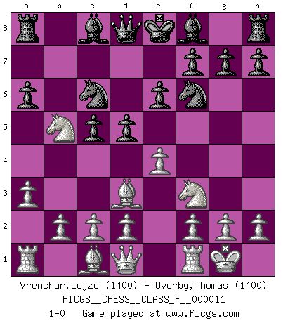 Last move : 1-0 2006 October 28 8:27:34 [Event "FICGS__CHESS__CLASS_F__000011"] [Site "FICGS"] [Date "2006.09.09"] [Round "1"] [White "Vrenchur,Lojze"] [Black "Overby,Thomas"] [Result "1-0"] [WhiteElo "1400"] [BlackElo "1400"] 1.e4 c5 2.Bc4 e6 3.Nf3 a6 4.O-O b5 5.Bd3 Nc6 6.a3 d5 7.Nc3 Nf6 8.Nxb5 1-0 This chess game has been lost on time (started : 2006.09.09 20:53:43) Sicilian defense Kingside Castling by player White (move 4) Player White won this chess game. Follow this game move after move (download)Whoever sees no other aim in the game than that of giving checkmate to one's opponent will never become a good Chess player. (Euwe) Die Leute spielen gegen mich seit 15 Jahren unter Ihren Möglichkeiten. (Robert James Fischer) La última cosa en que Fischer estaba interesado era en tonterías, siempre y cuando el Ajedrez estuviera involucrado. (Elie Agur) Echiquier : carré parfait, comme la Jérusalem nouvelle décrite par l'auteur de l'Apocalypse, huit cases sur huit, exaltation du chiffre 4, symbole du cosmos aux quatre horizons... où le noir et le blanc, l'ombre et la lumière, le mal et le bien s'entremêlent et se conjuguent. (Robert Couffignal, Le Gambit du poète) If things go wrong, don't go with them. (Roger Babson)