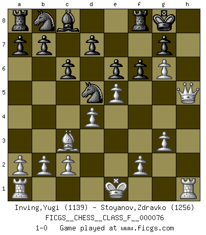 Last move : 1-0 2009 May 28 21:40:48 [Event "FICGS__CHESS__CLASS_F__000076"] [Site "FICGS"] [Date "2009.04.20"] [Round "1"] [White "Inving,Yugi"] [Black "Stoyanov,Zdravko"] [Result "1-0"] [WhiteElo "1139"] [BlackElo "1256"] 1.h4 e6 2.g3 c6 3.Nc3 Bc5 4.d4 Bb4 5.Nf3 Qa5 6.Bd2 Nf6 7.e4 Bxc3 8.Bxc3 Qd8 9.Bd3 O-O 10.e5 Nd5 11.Bxh7+ Kxh7 12.Ng5+ Kg8 13.Qh5 Qxg5 14.hxg5 f6 15.g6 1-0 Anti-Borg (Desprez) Opening Kingside Castling by player Black (move 9) Player White won this chess game. Follow this game move after move (download)There just isn't enough televised Chess. (David Letterman) Eine Person mit durchschnittlichem IQ kann etwa eine ELO von 2000 erreichen. (Jonathan Levitt) Tu sabes que vas a perder. Aún cuando tenía la ventaja, yo sabía que iba a perder. - al estar jugando con Fischer (Andrew Soltis) Il n'y a pas eu de défaite parce que je ne crois pas que cet ordinateur ait jamais existé. IBM a triché en refusant d'imprimer les modes de recherche de la machine. C'est évident, pendant le match, des coups décisifs ont été joués par des êtres humains. Aujourd'hui, les meilleurs spécialistes en informatique ne peuvent toujours pas expliquer comment Deep-Blue a pu jouer contre la logique des ordinateurs. IBM a gagné une guerre de communication, mais ils sont incapables de prouver que l'ordinateur a gagné tout seul. (Garry Kasparov) Your best chance to get a Royal Flush in a casino is in the bathroom. (Anonymous)
