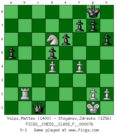 Last move : 0-1 2009 April 26 18:39:48 [Event "FICGS__CHESS__CLASS_F__000076"] [Site "FICGS"] [Date "2009.04.20"] [Round "1"] [White "Volpi,Matteo"] [Black "Stoyanov,Zdravko"] [Result "0-1"] [WhiteElo "1400"] [BlackElo "1256"] 1.e4 c5 2.Nf3 a6 3.Nc3 b5 4.d4 c4 5.a4 bxa4 6.Bxc4 e6 7.Nxa4 h6 8.O-O Nf6 9.Qe2 Bb7 10.Nd2 Nc6 11.c3 Na5 12.Nc5 Qb6 13.b4 Nxc4 14.Nxc4 Qc7 15.Bf4 Qxf4 16.Nxb7 Nxe4 17.Rae1 Nxc3 18.Qc2 Bxb4 19.Qb3 Nd5 20.Rb1 O-O 21.Qa4 Qc7 22.Rxb4 Nxb4 23.Qxb4 d5 24.Ncd6 a5 25.Qb2 Rab8 26.Rb1 Rfd8 27.f4 Rxd6 28.Nxd6 Rxb2 29.Rxb2 Qc1+ 0-1 Sicilian : O'Kelly variation Kingside Castling by player White (move 8) Kingside Castling by player Black (move 20) Player Black won this chess game. Follow this game move after move (download)If Chess is a science, it's a most inexact one. If Chess is an art, it is too exacting to be seen as one. If Chess is a sport, it's too esoteric. If Chess is a game, it's too demanding to be just a game. If Chess is a mistress, she's a demanding one. If Chess is a passion, it's a rewarding one. If Chess is life, it's a sad one. (Unknown) Du musst Deinen Gegner in einen tiefen dunklen Wald führen wo 2+2=5 ist und wo der Weg, der wieder hinausführt, nur breit genug für einen ist. (Mikhail Nekhemyevich Tal) El jugador táctico sabe que hacer cuando hay algo que hacer; mientras que el estratega sabe que hacer cuando no hay nada que hacer. (Gerald Abrahams) Les réformistes prétendent que les progrès de la théorie conduiront à la disparition des échecs, et qu'il faut, pour leur rendre vie, en remanier les règles. En réalité, qu'exprime cette affirmation? Le mépris de l'intuition, de l'imagination et de tous les autres éléments qui font des échecs un art. (Alexander Alekhine) Nowadays, anyone who cannot speak English and is incapable of using the Internet is regarded as backward. (Al-Waleed bin Talal)