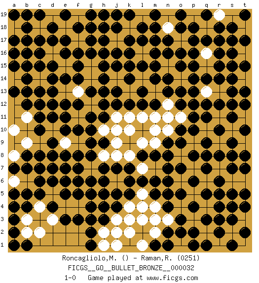Last move : 1-0 2009 April 21 2:5:22 [Event "FICGS__GO__BULLET_BRONZE__000032"] [Site "FICGS"] [Date "2009.04.20"] [Round "1"] [Black "Roncagliolo,Marco"] [White "Raman,Ranganathan"] [Result "1-0"] [Rating 2 "0251"] 1.d6 q4 2.r4 k4 3.q5 q6 4.p4 p5 5.q3 p7 6.o5 o6 7.p6 d4 8.q7 r7 9.q8 p8 10.r6 o8 11.o7 p9 12.n6 e5 13.p10 c5 14.q9 f6 15.e6 e7 16.c6 d7 17.c7 b6 18.c8 b8 19.d8 c9 20.e8 g7 21.f7 a7 22.n8 d7 23.f8 d5 24.g8 b7 25.o9 a9 26.h7 g6 27.h6 g5 28.g4 f4 29.h4 h5 30.j5 j6 31.f5 f6 32.g6 a8 33.e7 e4 34.f3 e3 35.g3 f2 36.g2 e2 37.g1 f1 38.c10 b10 39.b12 a11 40.d9 b9 41.c11 b11 42.c12 a12 43.a13 a10 44.k6 a14 45.a15 b14 46.b13 b15 47.b16 a16 48.b17 a17 49.a18 b18 50.c18 a19 51.b19 c19 52.d19 d18 53.e18 e19 54.f19 f18 55.g19 c17 56.c16 e17 57.c15 d16 58.d15 g18 59.h18 h19 60.j18 c14 61.d14 e15 62.d13 c13 63.d12 j19 64.k19 k18 65.l18 l19 66.m19 m18 67.l17 n19 68.m17 j17 69.h17 s7 70.r8 g17 71.h16 k17 72.j16 d10 73.k16 l16 74.m16 n17 75.k19 j17 76.l15 o18 77.g19 k18 78.m19 n18 79.a15 f16 80.k17 l19 81.n16 h19 82.j19 o17 83.a18 a17 84.o16 t18 85.p17 p19 86.p16 q18 87.q17 r19 88.r17 r18 89.s17 s19 90.t17 t16 91.t15 s16 92.s15 s18 93.r16 t16 94.s16 g15 95.m19 f19 96.h19 f14 97.e14 e13 98.e12 f13 99.f12 d11 100.e11 c13 101.e10 t6 102.g13 t8 103.s8 t7 104.t5 s5 105.t4 t9 106.t10 t3 107.s4 s6 108.r5 s3 109.s9 c14 110.b14 a16 111.b15 g14 112.p18 q19 113.h14 h15 114.j15 k14 115.g16 f17 116.r3 k10 117.r2 s2 118.s1 r1 119.t2 d1 120.q1 j14 121.h13 g12 122.h12 j13 123.j12 j11 124.k12 l11 125.l12 k13 126.l13 l14 127.m14 m13 128.k15 n12 129.j7 m11 130.g11 h10 131.h11 j9 132.n14 n15 133.o15 o14 134.m15 k13 135.n13 o13 136.m12 k11 137.p15 q15 138.p14 r15 139.p13 o12 140.p12 p11 141.q11 o11 142.o10 n10 143.n9 m9 144.m8 l9 145.l8 k8 146.k7 l7 147.l6 m7 148.m6 l5 149.n7 o8 150.p8 h8 151.g9 f9 152.h9 j8 153.g10 e9 154.f10 q16 155.r14 j10 156.q14 j3 157.k5 h2 158.f15 e16 159.o19 d17 160.t19 m4 161.n11 n12 162.o12 l3 163.k14 e18 164.j13 m10 165.n5 k2 166.m5 j1 167.n4 n3 168.o3 m2 169.o2 l1 170.n2 h1 171.n1 m3 172.m1 o1 173.p1 d19 174.h3 j2 175.j4 l4 176.a18 a17 177.a16 a18 178.d7 g5 179.h5 c18 180.b19 d2 181.f6 k3 182.b3 c3 183.b2 c1 184.b1 b4 185.c2 a3 186.a2 a1 187.g5 d16 188.e16 f17 189.e17 e18 190.e19 f19 191.f18 d19 192.g17 f19 193.g18 d18 194.d17 c18 195.f16 a18 196.b18 c19 197.c17 a17 198.a19 a18 199.e19 a5 200.a17 a6 201.c13 b2 202.s12 n18 203.o18 n19 204.n17 p19 205.m18 l7 206.q19 b5 207.s18 a4 208.t8 d10 209.d11 c4 210.c19 d3 211.r10 e1 212.s11 b1 213.r12 t13 214.s13 t14 215.s14 q13 216.q12 b3 217.t12 s6 218.s7 t6 219.s5 r19 220.r18 d19 221.d18 q16 222.r15 g15 223.f14 n18 224.s3 f13 225.p2 g14 226.t13 e9 227.o13 o11 228.t7 n12 229.p11 n11 230.h15 c2 231.a2 b9 232.b8 a8 233.a7 a10 234.b7 b6 235.b5 a6 236.a4 c4 237.d4 b3 238.b4 c5 239.a5 a6 240.c3 d5 241.e5 b11 242.b1 c2 243.a1 d3 244.e3 b2 245.a3 c4 246.c5 1-0 Here are the names of the openings (joseki) played in the four corners : Corner q4 : q4 r4 Hoshi (Hwajeom, Seongjeom, Xingwei`) 4-4 Point. The star or hoshi (4-4) point, emphasizing influence at the potential expense of territory. Corner d4 : d6 d4 Ootakamoku (Chaogao) 6-4 Point. The large takamoku (high) point (6-4), experimented with during the "new fuseki" movement in Japan in the 1930's. This point is seldom played as the initial corner point nowadays. Corner d16 : b12 a11 This joseki is unknown. A weak or weird move has probably been played in this corner. Corner q16 : l18 l19 This joseki is unknown. A weak or weird move has probably been played in this corner. Player Black won this Go (weiqi, baduk) game. Follow this game move after move (download)Grab the border points between two moyos. (Anonymous) I just play for fun. (Anna Kournikova)
