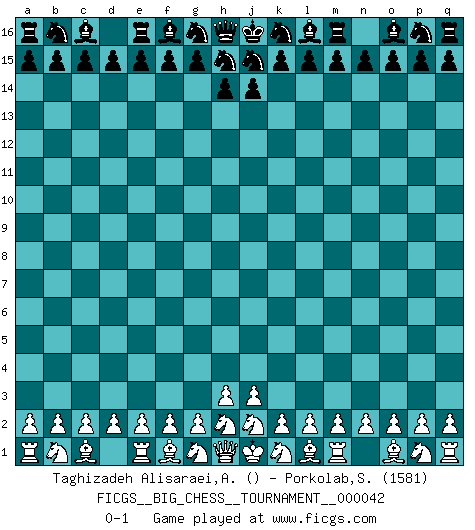 Last move : 0-1 2009 May 22 18:27:2 [Event "FICGS__BIG_CHESS__TOURNAMENT__000042"] [Site "FICGS"] [Date "2009.04.22"] [Round "1"] [White "Taghizadeh Alisaraei,Ahmad"] [Black "Porkolab,Sandor"] [Result "0-1"] [WhiteElo ""] [BlackElo "1581"] 0-1 This big chess game has been lost on time (started : 2009.04.22 8:55:19) Follow this game move after move (download)Chess books should be used as we use glasses: to assist the sight, although some players make use of them as if they thought they conferred sight. (Jose Raul Capablanca) Schach ist Leben. (Robert James Fischer) El arma más poderosa en el Ajedrez, es tener la próxima movida. (David Bronstein) 'L'échange des dames est un coup dur pour les deux adversaires...' Un journaliste lors d'une partie du match Spassky-Fischer It's only after you lost everything, Tyler says, that you're free to do anything. (Chuck Palahniuk, Fight Club)