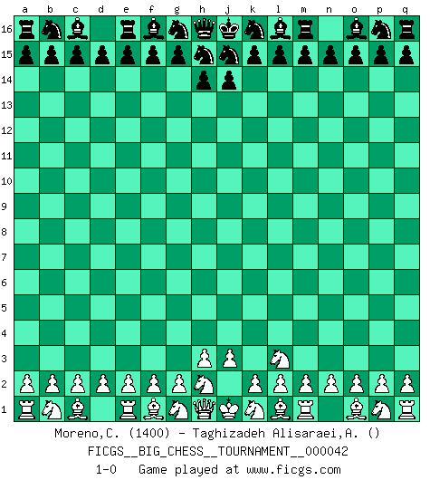 Last move : 1-0 2009 May 22 18:27:2 [Event "FICGS__BIG_CHESS__TOURNAMENT__000042"] [Site "FICGS"] [Date "2009.04.22"] [Round "1"] [White "Moreno,Ciro"] [Black "Taghizadeh Alisaraei,Ahmad"] [Result "1-0"] [WhiteElo "1400"] [BlackElo ""] 1.j2-l3 1-0 This big chess game has been lost on time (started : 2009.04.22 8:55:19) Follow this game move after move (download)You sit at the board and suddenly your heart leaps. Your hand trembles to pick up the piece and move it. But what Chess teaches you is that you must sit there calmly and think about whether it's really a good idea and whether there are other better ideas. (Stanley Kubrick) Karpov ist ein Museumsstück. (Garry Kasparov) Tu cuerpo tiene que estar en óptima condición. Tu Ajedrez se deteriora como lo hace tu cuerpo. No puedes separar la mente y el cuerpo. (Bobby Fischer) Les Echecs, c'est l'art de la guerre sans les charniers, c'est la résurrection des morts tombés au champ d'honneur, l'espoir perpétuel, la suprématie de l'intelligence sur la force, la culture de l'esprit. (F. Szpiner) You can only get smarter by playing a smarter opponent. (Revolver, movie)