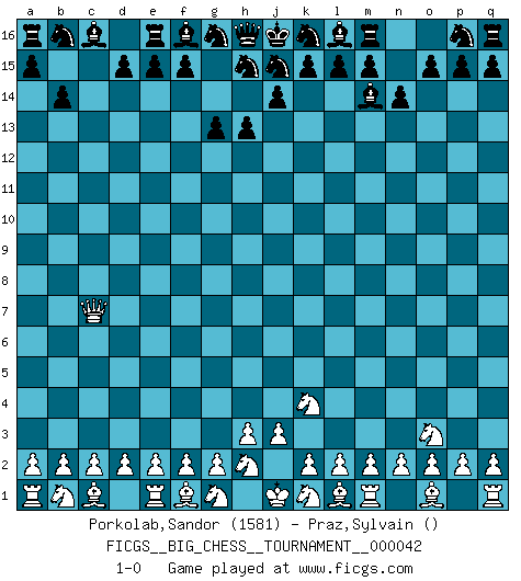 Last move : 1-0 2009 May 2 13:35:39 [Event "FICGS__BIG_CHESS__TOURNAMENT__000042"] [Site "FICGS"] [Date "2009.04.22"] [Round "1"] [White "Porkolab,Sandor"] [Black "Praz,Sylvain"] [Result "1-0"] [WhiteElo "1581"] [BlackElo ""] 1.j2-k4 g15-g13 2.h1-o7 n15-n14 3.o7-c7 o16-m14 4.c7-c15 h14-h13 5.c15-c7 b15-b14 6.p1-o3 1-0 Follow this game move after move (download)Chess makes man wiser and clear-sighted. (Vladimir Putin) Es ist peinlich, dass ich nie Weltmeister wurde. Es wäre leicht, Leonid Breschnjew als Ursache vorzuschieben, dessen Apparat den Vorzeigekommunisten Anatoli Karpow in allem unterstützte. Aber Garri Kasparow zum Beispiel, der ebenfalls von den Sowjets unerwünscht war, hat trotz der Widerstände den WM-Titel erobert. (Viktor Kortschnoi) Fischer es el jugador mas fuerte del mundo. De hecho, el jugador mas fuerte que jamas haya existido. (Larry Evans) Karpov est une pièce de musée. (Garry Kasparov) I feel so... helpless. (C-3PO in Star Wars ep.3)