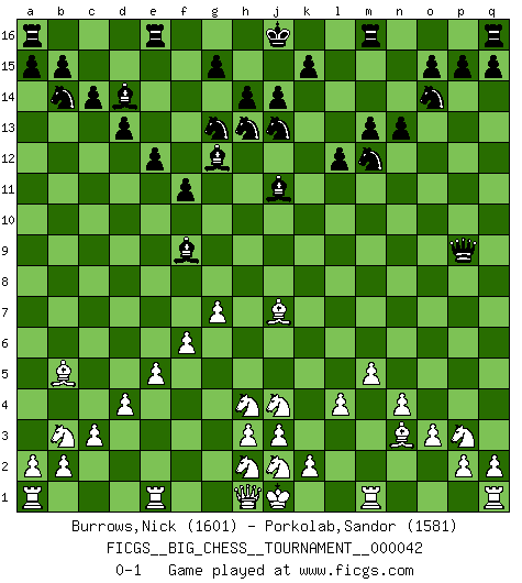 Last move : 0-1 2009 June 6 14:48:1 [Event "FICGS__BIG_CHESS__TOURNAMENT__000042"] [Site "FICGS"] [Date "2009.04.22"] [Round "1"] [White "Burrows,Nick"] [Black "Porkolab,Sandor"] [Result "0-1"] [WhiteElo "1601"] [BlackElo "1581"] 1.j2-h4 h15-g13 2.e2-e4 p16-o14 3.d2-d4 j15-k13 4.m2-m4 e15-e13 5.n2-n4 m15-m13 6.p1-n2 d15-d13 7.n2-p3 b16-d15 8.b1-d2 d15-b14 9.d2-b3 n15-n13 10.f1-b5 l16-m15 11.o2-o3 c15-c14 12.h2-j4 k16-h15 13.l1-n3 f16-d14 14.f2-f4 l15-l13 15.f4-f5 l13-l12 16.o1-f9 g16-j15 17.k1-h2 e13-e12 18.g1-j2 o16-j11 19.m4-m5 m15-l14 20.c1-j7 h15-j13 21.e4-e5 j15-h13 22.f5-f6 c16-g12 23.c2-c3 h16-p9 24.g2-g4 f15-f13 25.g4-g5 f13-f12 26.g5-g6 f12-f11 27.g6-g7 k13-m12 28.l2-l4 l14-f9 0-1 Follow this game move after move (download)The chessboard is the world, the pieces are the phenomena of the Universe, the rules of the game are what we call the laws of Nature and the player on the other side is hidden from us. (Thomas Huxley) Ich kenne keine einzige Person, die behaupten würde, Garri Kasparow sei ein guter Mensch (Nigel Short) Al jugar al Ajedrez entonces, podemos aprender: Primero: Previsión... Segundo: Prudencia... Tercero: Cautela... Y al final, aprendemos del Ajedrez el hábito de no ser desanimados por apariencias malas presentes en el estado de nuestros asuntos, el hábito de la esperanza por una oportunidad favorable y la perseveración de los secretos de los recursos. (Benjamin Franklin) A ce moment-là, je menaçais de comprendre la position ! (Clément L'Heureux) All men can see these tactics whereby I conquer, but what none can see is the strategy out of which victory is evolved. (Sun Tzu)