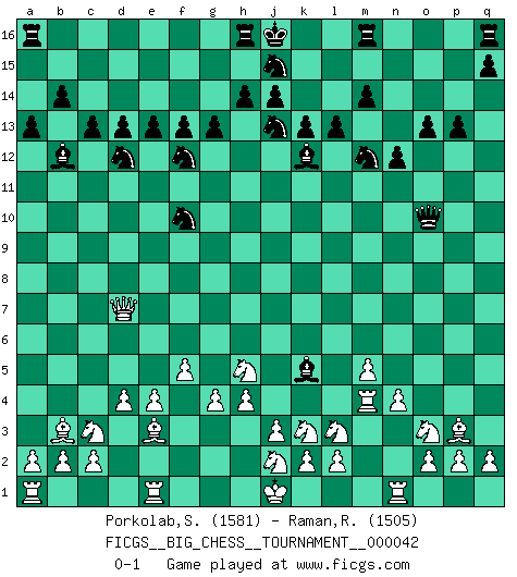 Last move : 0-1 2009 August 27 9:34:1 [Event "FICGS__BIG_CHESS__TOURNAMENT__000042"] [Site "FICGS"] [Date "2009.04.22"] [Round "1"] [White "Porkolab,Sandor"] [Black "Raman,Ranganathan"] [Result "0-1"] [WhiteElo "1581"] [BlackElo "1505"] 1.j2-k4 o15-o14 2.h1-o7 j15-h13 3.o7-c7 h16-l13 4.m2-m4 b16-c14 5.b1-c3 n15-n13 6.n2-n4 g16-f14 7.p1-o3 o16-m14 8.c7-p7 p15-p13 9.k1-l3 e15-e13 10.e2-e4 d15-d13 11.d2-d4 f16-b12 12.g1-j2 c16-f13 13.f1-b5 h15-j13 14.o1-k5 k16-l14 15.l1-p5 g15-g13 16.g2-g4 c14-d12 17.f2-f4 l13-o10 18.c1-e3 m14-k12 19.p7-b7 a15-a13 20.p5-q4 f13-g12 21.b7-c7 c15-c13 22.q4-p3 b15-b14 23.h3-h4 k15-k13 24.q1-n1 p16-n15 25.b5-a4 l16-k15 26.a4-b3 l14-m12 27.c7-f7 h13-f12 28.f4-f5 k15-m13 29.f7-k7 n15-l14 30.k4-h5 g12-f11 31.k7-h7 e16-h16 32.b3-m13 o14-o13 33.m13-b3 l14-j15 34.m4-m5 f11-e10 35.h7-h8 e10-h13 36.h2-k3 l15-l13 37.h8-e11 f14-g12 38.e11-c9 f15-f13 39.m1-m4 m15-m14 40.c9-d9 g12-f10 41.d9-q9 n13-n12 42.q9-f9 h13-e10 43.f9-d7 e10-k5 0-1 This big chess game has been lost on time (started : 2009.04.22 8:55:19) Follow this game move after move (download)Bobby is the finest Chess player this country ever produced. His memory for the moves, his brilliance in dreaming up combinations, and his fierce determination to win are uncanny. (John Collins) Schon mancher Spieler hat aufgegeben, um zu vermeiden, daß er eine Figur verliert. (Savielly Grigorievitsch Tartakower) El jugador táctico sabe que hacer cuando hay algo que hacer; mientras que el estratega sabe que hacer cuando no hay nada que hacer. (Gerald Abrahams) Mais n'est-ce pas déjà le limiter injurieusement que d'appeler les échecs un jeu? N'est-ce pas aussi une science, un art, ou quelque chose qui, comme le cercueil de Mahomet entre ciel et terre, est suspendu entre l'un et l'autre, et qui réunit un nombre incroyable de contraires ? (Stefan Zweig) But they are useless. They can only give you answers. (Pablo Picasso, about computers)