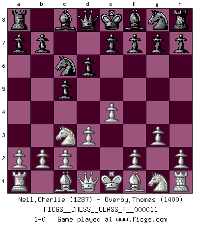 Last move : 1-0 2006 November 11 4:1:52 [Event "FICGS__CHESS__CLASS_F__000011"] [Site "FICGS"] [Date "2006.09.09"] [Round "1"] [White "Neil,Charlie"] [Black "Overby,Thomas"] [Result "1-0"] [WhiteElo "1287"] [BlackElo "1400"] 1.e4 c5 2.Nc3 Nc6 3.g3 d6 4.d3 1-0 This chess game has been lost on time (started : 2006.09.09 20:53:43) Sicilian : Closed Player White won this chess game. Follow this game move after move (download)Fischer is under obligation to nobody. (Joseph Platz) Ein unbeabsichtigtes Patt ist der Gipfel der Dummheit. (Anonymous) Nunca nadie ha ganado una partida de Ajedrez rindiendose. (Unknown) Si je n'étais pas joueur d'échecs, je serais le meilleur dans quelque chose d'autre. (Anatoli Karpov) I take risks, sometimes patients die, but not taking risks causes more patients to die. So I guess my biggest problem is I've been cursed with the ability to do the math. (Gregory House, House M.D.)