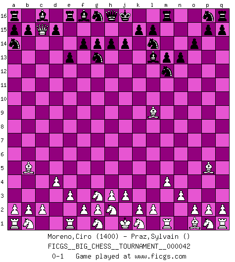 Last move : 0-1 2009 April 27 2:36:58 [Event "FICGS__BIG_CHESS__TOURNAMENT__000042"] [Site "FICGS"] [Date "2009.04.22"] [Round "1"] [White "Moreno,Ciro"] [Black "Praz,Sylvain"] [Result "0-1"] [WhiteElo "1400"] [BlackElo ""] 1.j2-g3 j15-k13 2.d2-d4 m15-m13 3.h1-o7 h15-g13 4.c1-l9 l16-o13 5.o7-o13 o15-o14 6.e2-e3 k13-m12 7.o13-o10 n15-n13 8.m2-m4 k16-l14 9.f1-b5 o16-l13 10.o10-c10 g15-g14 11.c10-c15 e15-e13 12.l1-p5 f15-f14 13.n2-n3 b16-a14 0-1 Follow this game move after move (download)Chess is mental torture. (Garry Kasparov) Mein Name ist Rustam Kamsky. Sie haben meinen Sohn belästigt. Bereiten Sie sich aufs Sterben vor. (Rustam Kamsky) Cualquier cambio de material en una posición debe venir por medio de un mate, una captura o promoción de Peón. (Purdy) Demandez au pauvre Cg1 ce qu'il en pense. Eduard Gufeld à propos de la variante Saemisch de l'Est-Indienne. Chess is everything: art, science and sport. (Anatoly Karpov)