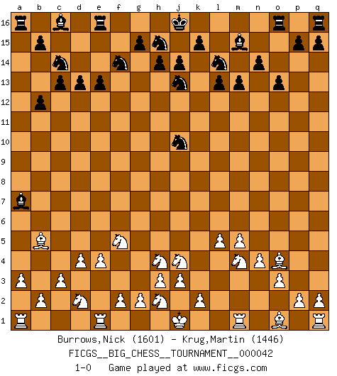 Last move : 1-0 2009 April 26 22:50:44 [Event "FICGS__BIG_CHESS__TOURNAMENT__000042"] [Site "FICGS"] [Date "2009.04.22"] [Round "1"] [White "Burrows,Nick"] [Black "Krug,Martin"] [Result "1-0"] [WhiteElo "1601"] [BlackElo "1446"] 1.j2-h4 n15-n14 2.h1-o7 o15-o13 3.o7-f15 g16-f14 4.f15-a10 j15-k13 5.e2-e4 d15-d13 6.f1-b5 h16-l13 7.k1-l3 l13-c5 8.a10-f5 c5-f5 9.h4-f5 o16-c5 10.d2-d4 c5-a7 11.c2-c3 k13-h12 12.m2-m4 h12-j10 13.n2-n4 p16-n15 14.l1-o4 e15-e13 15.o2-o3 f16-b12 16.l3-j4 c15-c13 17.p1-n2 b16-c14 18.m4-m5 m16-o16 19.n2-m4 l15-l13 20.c1-h6 a15-a13 21.h6-b12 a13-b12 22.a2-a3 m15-m13 23.b1-d2 n15-l14 24.g1-j2 l16-m15 25.j2-h4 h15-j13 26.l2-l4 k16-h15 27.l4-l5 1-0 Follow this game move after move (download)Chess is above all, a fight ! (Emanuel Lasker) Wenn Schach ein enormer Dschungel ist, der seine Myriaden von Geheimnissen nicht preisgeben will, dann sind Computer die Kettensägen einer gewaltigen ökologisch unsensiblen Nutzholzfirma. (Nigel Short) Una mala movida nulifica cuarenta buenas. (Horowitz) Les Echecs représentent une sphère d'idées créatrices basée sur la volonté des deux protagonistes. (Smyslov) He who defends everything defends nothing. (Frederick the Great)