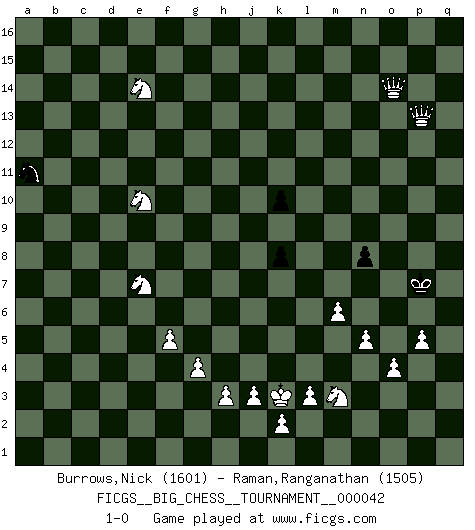 Last move : 1-0 2009 July 9 0:44:11 [Event "FICGS__BIG_CHESS__TOURNAMENT__000042"] [Site "FICGS"] [Date "2009.04.22"] [Round "1"] [White "Burrows,Nick"] [Black "Raman,Ranganathan"] [Result "1-0"] [WhiteElo "1601"] [BlackElo "1505"] 1.j2-h4 d15-d13 2.h1-o7 g15-g14 3.o7-o15 p16-o14 4.o15-f7 c16-f13 5.p2-p3 m15-m13 6.o1-q3 e15-e14 7.q3-f13 e14-f13 8.o2-o4 n15-n13 9.p1-o3 l16-n14 10.e2-e4 o16-l13 11.d2-d4 q16-n16 12.f7-c7 c15-c14 13.c7-l15 l13-m14 14.l15-p15 k16-m15 15.p15-p8 b16-d15 16.f2-f3 n16-p16 17.p8-j2 m16-l16 18.k1-l3 h16-d12 19.c2-c3 f16-a11 20.h2-k3 l16-l13 21.b1-d2 d12-a9 22.j2-h2 a9-h2 23.j1-h2 l13-g13 24.f1-c4 n13-n12 25.l3-j4 m14-p11 26.n2-n4 e16-e12 27.e4-e5 n14-q11 28.j4-l3 e12-g12 29.g2-g4 a16-e16 30.d2-e4 p16-l16 31.m2-m4 j15-h13 32.m4-m5 h13-j11 33.l1-n3 j11-k9 34.o3-m4 k9-j7 35.c1-j7 e16-e12 36.l3-k5 m15-k14 37.l2-l3 d15-f14 38.e1-f1 f14-h13 39.g1-j2 g16-f14 40.m4-n6 g12-j12 41.j7-a15 c14-c13 42.a15-c13 a11-c13 43.n3-c13 e12-c12 44.c13-e11 c12-c4 45.e11-g13 h15-g13 46.j2-g3 c4-c12 47.f3-f4 c12-b12 48.b2-b3 j16-h15 49.c3-c4 f14-e12 50.f4-f5 h13-g11 51.f1-b1 l16-l13 52.b3-b4 l13-h13 53.a2-a4 j12-h12 54.n6-m4 o14-p12 55.b4-b5 k14-j12 56.c4-c5 q15-q13 57.c5-c6 b12-d12 58.m1-d1 p12-n11 59.a4-a5 n11-m9 60.b5-b6 m9-k8 61.c6-c7 e12-d10 62.e4-f2 g11-f9 63.f2-d3 f9-e7 64.d3-f4 g13-f11 65.d4-d5 p11-n13 66.q1-e1 f11-g9 67.d5-d6 e7-c6 68.f4-g6 g9-f7 69.d1-d5 f7-g5 70.e1-c1 c6-e5 71.g6-e5 d12-e12 72.c1-e1 j12-g11 73.a1-a3 d10-f9 74.e5-f3 g5-h7 75.e1-e12 f13-e12 76.b1-e1 h7-k6 77.d6-d7 k6-l4 78.h2-j2 n13-m14 79.a3-e3 f15-f13 80.d7-d8 k8-h7 81.g3-h5 f9-h8 82.e3-e11 g11-f9 83.e11-q11 m13-m12 84.q11-b11 j14-j13 85.b11-b15 h15-j14 86.m4-l6 h8-k7 87.b15-b16 m14-l13 88.b16-q16 k7-m6 89.k5-m6 l4-m6 90.n4-n5 m6-l4 91.q16-q13 l13-b4 92.e1-e9 f9-e7 93.d5-b5 b4-d6 94.e9-k9 e7-g8 95.q13-k13 h12-k12 96.k13-k12 j13-k12 97.h4-g6 g8-h6 98.k3-j5 l4-n3 99.j5-h7 h13-h7 100.m5-m6 h7-q7 101.l6-j5 q7-q2 102.b5-b1 n3-m5 103.j2-k3 j14-k13 104.g6-e5 m12-m11 105.e5-c4 d6-f8 106.j5-g6 f8-j11 107.b1-p1 m5-n3 108.k9-n9 q2-q12 109.n9-d9 q12-q10 110.d9-d13 j11-g9 111.d13-d9 q10-k10 112.h5-k4 g9-k6 113.d9-p9 k13-l12 114.p1-q1 h14-h13 115.q1-q15 k6-o10 116.p9-p14 k15-k14 117.q15-n15 k10-n10 118.p14-p10 o10-l13 119.p10-n10 m11-n10 120.n15-n12 l12-m11 121.n12-n16 k12-k11 122.n16-g16 n3-o5 123.p3-p4 o5-n3 124.p4-p5 n3-p2 125.k4-m3 k11-k10 126.g16-g14 h6-j8 127.g14-g13 f13-f12 128.g13-h13 l13-g9 129.h13-e13 e12-e11 130.e13-f13 g9-h10 131.f13-h13 h10-k8 132.h13-k13 k8-n11 133.k13-k11 m11-m10 134.k11-n11 m10-n11 135.a5-a6 j8-g9 136.a6-a7 g9-e10 137.a7-a8 e10-c11 138.b6-b7 c11-d9 139.c7-c8 d9-b8 140.f3-e5 p2-q4 141.c4-b6 e11-e10 142.b6-d7 b8-c10 143.e5-c6 f12-f11 144.b7-b8 k14-k13 145.a8-a9 k10-k9 146.a9-a10 f11-f10 147.b8-b9 c10-a9 148.c6-a7 n10-n9 149.a10-a11 a9-b11 150.c8-c9 n11-o10 151.c9-c10 b11-a13 152.g6-e7 k13-k12 153.b9-b10 q4-p6 154.b10-b11 p6-o8 155.a11-a12 o8-m9 156.b11-b12 a13-c12 157.a12-a13 m9-k10 158.a13-a14 c12-b14 159.c10-c11 k10-h11 160.a7-c8 h11-f12 161.d7-c9 n9-n8 162.c8-d10 f12-d13 163.c9-e10 d13-c15 164.d10-e12 c15-a14 165.d8-d9 b14-c12 166.d9-d10 c12-e13 167.e12-f10 a14-c15 168.d10-d11 e13-f11 169.c11-c12 f11-d10 170.b12-b13 c15-a16 171.f10-e12 d10-b11 172.c12-c13 b11-a13 173.d11-d12 k9-k8 174.d12-d13 a13-c12 175.d13-d14 c12-e13 176.c13-c14 a16-b14 177.e12-c13 e13-f15 178.d14-d15 b14-d13 179.c13-e14 d13-e15 180.c14-c15 f15-d14 181.d15-d16 d14-b13 182.d16-e15 b13-a15 183.e15-f16 k12-k11 184.f16-a16 a15-b13 185.c15-c16 o10-n9 186.c16-m16 k11-k10 187.a16-d13 b13-a11 188.d13-n13 n9-o8 189.m16-o14 o8-p7 190.n13-p13 1-0 Follow this game move after move (download)The hallmark of the artist is simplicity. (Larry Evans) Sie bekommen vielleicht den Eindruck, dass die Spitzenspieler überhaupt gar nicht so stark sind. Aber das stimmt nicht. Es ist eine Illusion. Mit einem Computer an der Seite ist es sehr leicht, Urteile zu fällen, aber wenn man alleine am Brett sitzt, sieht die Sache ganz anders aus. (Vladimir Kramnik) Solo existe una cosa que Fischer hace en el Ajedrez sin placer: ¡perder!. (Boris Spassky) Je fais ceci parce que dans cinquante coups j'obtiendrai cela; je m'appelle Mikhail Moisevitch Botvinnik. (Botvinnik) The meaning of life is that it is to be lived, and it is not to be traded and conceptualized and squeezed into a pattern of systems. (Bruce Lee)