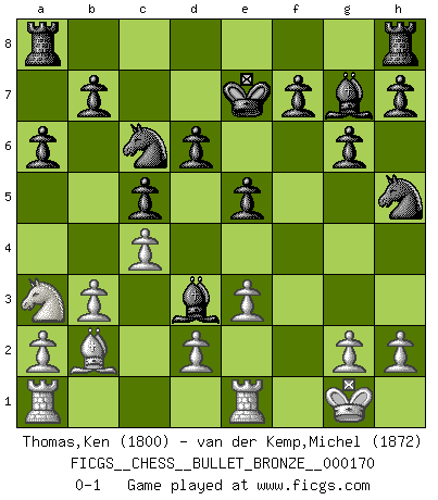 Last move : 0-1 2009 April 23 3:49:48 [Event "FICGS__CHESS__BULLET_BRONZE__000170"] [Site "FICGS"] [Date "2009.04.22"] [Round "1"] [White "Thomas,Ken"] [Black "van der Kemp,Michel"] [Result "0-1"] [WhiteElo "1800"] [BlackElo "1872"] 1.e4 c5 2.Nf3 d6 3.c4 Nf6 4.b3 g6 5.Na3 Nxe4 6.Bb2 Nf6 7.Bd3 Nc6 8.Qe2 Bg7 9.Ng5 e5 10.Nb5 a6 11.Na3 Nh5 12.Qf3 Qxg5 13.O-O Bg4 14.Qe4 Bf5 15.Qe3 Qxe3 16.fxe3 Bxd3 17.Rfe1 Ke7 0-1 This chess game has been lost on time (started : 2009.04.22 19:2:26) Sicilian Kingside Castling by player White (move 13) Player Black won this chess game. Follow this game move after move (download)Spassky will not be psyched out by Fischer. (Mike Goodall) Die Leute spielen gegen mich seit 15 Jahren unter Ihren Möglichkeiten. (Robert James Fischer) El Ajedrez es de 30 a 40 por ciento psicología. Uno no cuenta con esto cuando se juega contra una computadora. No lo puedo confundir. (Judith Polgar) On entre au jeu d'Echecs comme on entre en Religion. Pour le joueur d'Echecs, la partie d'Echecs c'est l'office, la messe, le défilé du 1er Mai, le dépôt de gerbe au Monument aux Morts. C'est un drame sacré. (Michel Roos) The problem with troubleshooting is that trouble shoots back. (Anonymous)