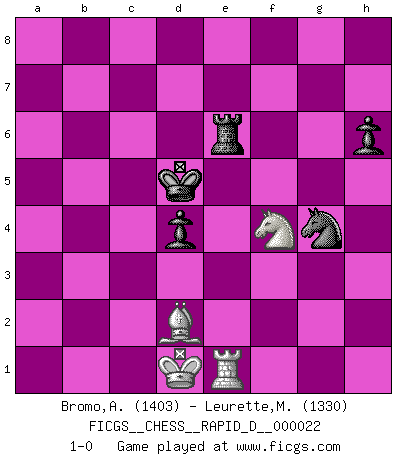 Last move : 1-0 2009 May 18 9:52:10 [Event "FICGS__CHESS__RAPID_D__000022"] [Site "FICGS"] [Date "2009.04.25"] [Round "1"] [White "Bromo,Alexis"] [Black "Leurette,Marc-Antoine"] [Result "1-0"] [WhiteElo "1403"] [BlackElo "1330"] 1.e4 e5 2.d4 exd4 3.Qxd4 Nc6 4.Qe3 d6 5.Nc3 Nf6 6.Bd2 Bg4 7.f3 Bh5 8.g4 Bg6 9.Bd3 d5 10.exd5 Ne7 11.Bb5+ Nd7 12.d6 cxd6 13.Nd5 a6 14.Bxd7+ Qxd7 15.Nb6 Qd8 16.Nxa8 Qxa8 17.O-O-O Qc8 18.c3 Qc5 19.Re1 Qxe3 20.Rxe3 Kd7 21.c4 b5 22.b3 bxc4 23.bxc4 d5 24.c5 Nc6 25.Rc3 d4 26.Rc2 Bxc2 27.Kxc2 Bxc5 28.Ne2 Ne5 29.Nf4 g5 30.Nd3 f6 31.Nxc5+ Kc6 32.Nxa6 Ra8 33.Nb4+ Kb5 34.Nd3 Rxa2+ 35.Nb2 Nxf3 36.Bc1 Ne5 37.Kb1 Ra6 38.h3 Kc5 39.h4 Nxg4 40.hxg5 fxg5 41.Bxg5 h6 42.Nd3+ Kc4 43.Nb2+ Kd5 44.Bd2 Ke4 45.Re1+ Kd5 46.Nd3 Rb6+ 47.Kc2 Rc6+ 48.Kd1 Re6 49.Nf4+ 1-0 Centre game : Paulsen attack Queenside Castling by player White (move 17) 10 pieces endgame at move 40 : White KRBN , Black KRNPPP WHITE : King + 1 Rook 1 Bishop 1 Knight BLACK : King + 1 Rook 1 Knight 3 Pawns 9 pieces endgame at move 41 : White KRBN , Black KRNPP WHITE : King + 1 Rook 1 Bishop 1 Knight BLACK : King + 1 Rook 1 Knight 2 Pawns Player White won this chess game. Follow this game move after move (download)Life is a kind of Chess, with struggle, competition, good and ill events. (Benjamin Franklin) Je älter ich werde, um so mehr schätze ich die Bauern. (Paul Keres) Cuando la partida de Ajedrez termina, el Peón y el Rey regresan a la misma caja. (Irish saying) Les Echecs ne sont pas pour les âmes timides. Ils requièrent un homme entier, qui ne s'arrête pas aveuglément à ce qui a été déjà établi, mais qui tente individuellement de sonder les profondeurs du jeu. (W. Steinitz) You cannot beat a roulette table unless you steal money from it. (Albert Einstein)