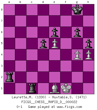 Last move : 0-1 2009 June 10 9:24:25 [Event "FICGS__CHESS__RAPID_D__000022"] [Site "FICGS"] [Date "2009.04.25"] [Round "1"] [White "Leurette,Marc-Antoine"] [Black "Huxtable,Simon"] [Result "0-1"] [WhiteElo "1330"] [BlackElo "1471"] 1.e4 c6 2.d4 d5 3.exd5 cxd5 4.Bb5+ Nc6 5.Nf3 Nf6 6.Ne5 Qb6 7.Bxc6+ bxc6 8.O-O Bf5 9.Be3 Qxb2 10.Nd2 Qxc2 11.Qxc2 Bxc2 12.Rac1 Ba4 13.Rc5 e6 14.Ra5 Bb5 15.a4 Bxf1 16.Nxf1 Nd7 17.Nxc6 a6 18.Ne5 Nxe5 19.dxe5 Bb4 20.Rc5 Bxc5 21.Bxc5 Rc8 22.Bd6 Rc1 23.Ba3 Ra1 24.Bb2 Rxa4 25.g3 O-O 26.f4 Rb8 27.Bc3 Rc4 28.Bd2 Ra8 29.Ne3 R4c8 30.h4 a5 31.f5 a4 32.fxe6 fxe6 33.Nd1 a3 34.Nc3 a2 35.Nxa2 Rxa2 36.Be1 Rc1 37.Kf1 h5 38.g4 g6 0-1 Caro-Kann : Exchange variation Kingside Castling by player White (move 8) Kingside Castling by player Black (move 25) Player Black won this chess game. Follow this game move after move (download)You are for me the Queen on d8 and I am the Pawn on d7 !! (Eduard Gufeld) Der Knackpunkt bei der Konzentration ist, daß wir nur durch sie etwas Neues und Ungewöhnliches am Schachbrett finden können. Sie ist der einzige Weg durch neue neue Ideen eine Überraschung zu bereiten. (Garry Kasparov) Dejen al perfeccionista jugar por correo. (Yasser Seirawan) Fischer est le meilleur joueur du monde et Karpov n'est qu'un joueur de bistrot. (Garry Kasparov, agé de 16 ans) The worth of a book is to be measured by what you can carry away from it. (James Bryce)