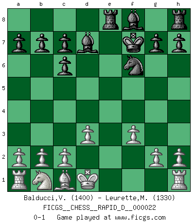 Last move : 0-1 2009 June 9 7:35:35 [Event "FICGS__CHESS__RAPID_D__000022"] [Site "FICGS"] [Date "2009.04.25"] [Round "1"] [White "Balducci,Vincent"] [Black "Leurette,Marc-Antoine"] [Result "0-1"] [WhiteElo "1400"] [BlackElo "1330"] 1.e4 e5 2.Nf3 Nc6 3.Bb5 Nf6 4.Bxc6 dxc6 5.Nxe5 Qd4 6.Nxf7 Qxe4+ 7.Qe2 Qxe2+ 8.Kxe2 Kxf7 9.d3 Bg4+ 10.f3 Re8+ 11.Kd1 Bd7 0-1 This chess game has been lost on time (started : 2009.04.25 14:17:45) Ruy Lopez : Berlin defense Player Black won this chess game. Follow this game move after move (download)I'd rather have a Pawn than a finger. (Reuben Fine) Nie in meinem Leben habe ich die französische Verteidigung gespielt, welche die Stumpfsinnigste von allen ist. (Wilhelm Steinitz) Realmente no sabemos como el juego fue inventado, aunque hay sospechas. Tan pronto como descubramos a los culpables, se los haremos saber. (Bruce Pandolfini) Avec des compensations pour le matériel en plus... (Anonyme) First of all, we have to go back to the classical time control. (Anatoly Karpov)