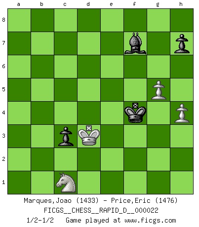 Last move : 1/2-1/2 2009 July 6 19:8:46 [Event "FICGS__CHESS__RAPID_D__000022"] [Site "FICGS"] [Date "2009.04.25"] [Round "1"] [White "Marques,Joao"] [Black "Price,Eric"] [Result "1/2-1/2"] [WhiteElo "1433"] [BlackElo "1476"] 1.e4 e5 2.Nf3 Nc6 3.Bb5 a6 4.Ba4 Nf6 5.O-O Nxe4 6.Re1 Nc5 7.Bxc6 dxc6 8.Nxe5 Be7 9.Qe2 Be6 10.d4 Nd7 11.Bf4 O-O 12.Nxf7 Bxf7 13.Qxe7 Re8 14.Qxd8 Raxd8 15.Nc3 Nf6 16.Bxc7 Rxd4 17.Be5 Rd2 18.Bxf6 gxf6 19.Rxe8+ Bxe8 20.Rc1 Bg6 21.Nb1 Rxc2 22.Rxc2 Bxc2 23.Nc3 Kf7 24.Kf1 Bd3+ 25.Ke1 Ke6 26.Kd2 Bf1 27.g3 Bg2 28.Ke3 f5 29.Ne2 Ke5 30.Nf4 Be4 31.Nh5 c5 32.f3 Bb1 33.a3 b5 34.g4 fxg4 35.fxg4 a5 36.Nf4 c4 37.Ne2 b4 38.axb4 axb4 39.Kf3 Bd3 40.Nc1 Bf1 41.h4 c3 42.bxc3 bxc3 43.Ke3 Bc4 44.g5 Bf7 45.Kd3 Kf4 1/2-1/2 Ruy Lopez : Open (Tarrasch) defense Kingside Castling by player White (move 5) Kingside Castling by player Black (move 11) 10 pieces endgame at move 38 : White KNPPP , Black KBPPP WHITE : King + 1 Knight 3 Pawns BLACK : King + 1 Bishop 3 Pawns 9 pieces endgame at move 42 : White KNPPP , Black KBPP WHITE : King + 1 Knight 3 Pawns BLACK : King + 1 Bishop 2 Pawns 8 pieces endgame at move 42 : White KNPP , Black KBPP WHITE : King + 1 Knight 2 Pawns BLACK : King + 1 Bishop 2 Pawns This chess game ended in a draw. Follow this game move after move (download)Everything is in a state of flux, and this includes the world of Chess. (Mikhail Botvinnik) Ich brauche nur einen Blick auf das Schachbrett zu werfen, und weiß schon, was in der Stellung steckt, was geschehen kann und was geschehen wird. Alle übrigen suchen und prüfen, ich aber weiß es! (José Raúl Capablanca) El jugador de combinación piensa hacia adelante; comienza de la posición dada y trabaja las movidas contundentes en su mente. (Emanuel Lasker) Le jeu d'échecs est comme rejeté hors du temps. (Antoine de Saint-Exupéry) Either move or be moved. (Ezra Pound)