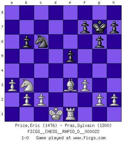 Last move : 1-0 2009 May 27 0:55:42 [Event "FICGS__CHESS__RAPID_D__000022"] [Site "FICGS"] [Date "2009.04.25"] [Round "1"] [White "Price,Eric"] [Black "Praz,Sylvain"] [Result "1-0"] [WhiteElo "1476"] [BlackElo "1300"] 1.e4 c5 2.Nf3 Nc6 3.d4 cxd4 4.Nxd4 Nf6 5.Nc3 g6 6.Be3 a6 7.f3 e5 8.Nb3 Bb4 9.Qd2 O-O 10.a3 Bxc3 11.Qxc3 d5 12.exd5 Nxd5 13.Qd2 Be6 14.Bh6 Re8 15.O-O-O b6 16.Bc4 Nce7 17.Rhe1 Rc8 18.Bxa6 Rc6 19.Bb5 Rc4 20.Bxc4 Nc6 21.Bxd5 Bxd5 22.Qxd5 Qf6 23.Qd2 Rd8 24.Qg5 Qxg5+ 25.Bxg5 Rxd1+ 26.Kxd1 Kg7 27.Be3 1-0 Sicilian defense Kingside Castling by player Black (move 9) Queenside Castling by player White (move 15) Player White won this chess game. Follow this game move after move (download)Chess is no whit inferior to the violin, and we have a large number of professional violinists. (Mikhail Botvinnik) Im Schach nämlich geht es darum, daß Ich des Gegners klein zu kriegen, sein Ego zu zerbrechen und zu zermahlen, seine Selbstachtung zu zertreten und zu verscharren und seine ganze mißachtenswerte sogenannte Persönlichkeit ein für alle Mal tot zu hacken und zu zerstampfen und dadurch die menschliche Gesellschaft von einer stinkenden Pestbeule zu befreien. Es ist ein königliches Spiel. (Robert James Fischer) El Ajedrez no es como la vida... ¡tiene reglas!. (Mark Pasternak) Mais n'est-ce pas déjà le limiter injurieusement que d'appeler les échecs un jeu? N'est-ce pas aussi une science, un art, ou quelque chose qui, comme le cercueil de Mahomet entre ciel et terre, est suspendu entre l'un et l'autre, et qui réunit un nombre incroyable de contraires ? (Stefan Zweig) Don't anthropomorphize computers - they hate it. (Anonymous)