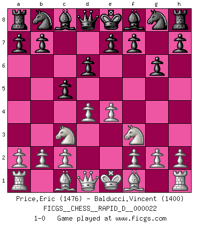 Last move : 1-0 2009 June 3 19:8:3 [Event "FICGS__CHESS__RAPID_D__000022"] [Site "FICGS"] [Date "2009.04.25"] [Round "1"] [White "Price,Eric"] [Black "Balducci,Vincent"] [Result "1-0"] [WhiteElo "1476"] [BlackElo "1400"] 1.e4 c5 2.Nf3 d6 3.d4 g6 4.Nc3 1-0 This chess game has been lost on time (started : 2009.04.25 14:17:45) Sicilian Player White won this chess game. Follow this game move after move (download)In a gambit you give up a Pawn for the sake of getting a lost game. (Samuel Standige Boden) Kritik überlasse ich den Spießern. Ich zeige nichts, wofür ich mich schämen muss. (Alexandra Kosteniuk) Alguna parte de un error es siempre correcto. (Savielly Tartakover) Aux échecs, les retours au sommet sont rares : les dommages psychologiques consécutifs à une défaite sont trop sévères. (Daily Telegraph) Cactus - It is depressed cucumber. (Ilmars Cirulis)