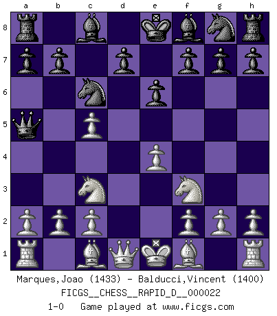 Last move : 1-0 2009 June 5 19:13:47 [Event "FICGS__CHESS__RAPID_D__000022"] [Site "FICGS"] [Date "2009.04.25"] [Round "1"] [White "Marques,Joao"] [Black "Balducci,Vincent"] [Result "1-0"] [WhiteElo "1433"] [BlackElo "1400"] 1.e4 c5 2.Nf3 e6 3.d4 Nc6 4.dxc5 Qa5+ 5.Nc3 1-0 This chess game has been lost on time (started : 2009.04.25 14:17:45) Sicilian defense Player White won this chess game. Follow this game move after move (download)A sacrifice is best refuted by accepting it. (Wilhelm Steinitz) Der Umstand, daß uns eine 7 Stunden Zeitkontrolle ermöglicht eine großartige, tiefe Partie zu spielen, ist für die Massenmedien nicht weiter von Bedeutung. (Alexej Shirov) Al jugar al Ajedrez entonces, podemos aprender: Primero: Previsión... Segundo: Prudencia... Tercero: Cautela... Y al final, aprendemos del Ajedrez el hábito de no ser desanimados por apariencias malas presentes en el estado de nuestros asuntos, el hábito de la esperanza por una oportunidad favorable y la perseveración de los secretos de los recursos. (Benjamin Franklin) Il vaut toujours mieux jouer un plan faux de façon logique que de n'avoir pas de plan du tout. (Victor Kortchnoï) When you stop learning you start dying. (M. Scott Adams)