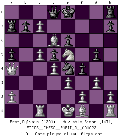 Last move : 1-0 2009 June 11 7:41:5 [Event "FICGS__CHESS__RAPID_D__000022"] [Site "FICGS"] [Date "2009.04.25"] [Round "1"] [White "Praz,Sylvain"] [Black "Huxtable,Simon"] [Result "1-0"] [WhiteElo "1300"] [BlackElo "1471"] 1.d4 d5 2.c4 c6 3.Nc3 Nf6 4.Bf4 Bf5 5.e3 e6 6.Nf3 Nbd7 7.g3 Bb4 8.Rc1 Nb6 9.c5 Bxc3+ 10.Rxc3 Na4 11.Qxa4 Ne4 12.Rc1 a6 13.b4 Bg4 14.Ne5 f6 15.Nxg4 g5 16.Bd6 f5 17.Ne5 a5 18.b5 f4 19.bxc6 Ra7 20.c7 1-0 QGD Slav defense Player White won this chess game. Follow this game move after move (download)Every Pawn is a potential Queen. (James Mason) Die westlichen Werte sind eine Sprache, welche die Putin-Administration nicht versteht. (Garry Kasparov) Tu puedes aprender mucho mas de una partida que pierdas que de una partida ganada. Tendras que perder cientos de partidas antes de llegar a ser un buen jugador. (Jose Raul Capablanca) Les échecs sont plus proches de l'art de l'assassinat que de l'art de la guerre. (Arturo Perez-Reverte) Whoever said the pen is mightier than the sword obviously never encountered automatic weapons. (US General Douglas MacArthur)
