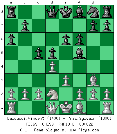 Last move : 0-1 2009 June 8 7:28:44 [Event "FICGS__CHESS__RAPID_D__000022"] [Site "FICGS"] [Date "2009.04.25"] [Round "1"] [White "Balducci,Vincent"] [Black "Praz,Sylvain"] [Result "0-1"] [WhiteElo "1400"] [BlackElo "1300"] 1.Nf3 d5 2.d4 Nc6 3.Bf4 Bf5 4.Ne5 Nxe5 5.Bxe5 f6 6.Bg3 e6 7.e3 a6 8.Nd2 c5 0-1 This chess game has been lost on time (started : 2009.04.25 14:17:45) Reti Opening Player Black won this chess game. Follow this game move after move (download)A great player and a great example for many. His book My 60 Memorable Games had a big impact on me. It is a shame he didn't continue to enrich the world of chess with his unparalleled understanding after 1972. (Jan Timman, about Bobby Fischer's death) Es tut gut, die Entwicklungsperiode von, [...] demokratischem Geist durchdringen zu lassen. Wie undemokratisch wäre es doch beispielsweise, den einen Offizier große Spaziertouren vornehmen zu lassen, während die anderen zu Hause säßen und sich entsetzlich langweilten. (Aaron Nimzowitsch) Dejen al perfeccionista jugar por correo. (Yasser Seirawan) On entre au jeu d'Echecs comme on entre en Religion. Pour le joueur d'Echecs, la partie d'Echecs c'est l'office, la messe, le défilé du 1er Mai, le dépôt de gerbe au Monument aux Morts. C'est un drame sacré. (Michel Roos) Computers are like Old Testament gods; lots of rules and no mercy. (Joseph Campbell)