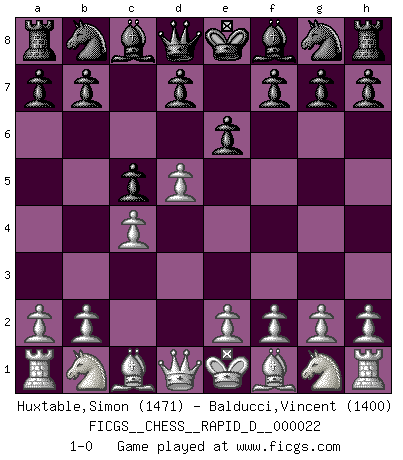 Last move : 1-0 2009 June 6 7:15:45 [Event "FICGS__CHESS__RAPID_D__000022"] [Site "FICGS"] [Date "2009.04.25"] [Round "1"] [White "Huxtable,Simon"] [Black "Balducci,Vincent"] [Result "1-0"] [WhiteElo "1471"] [BlackElo "1400"] 1.d4 e6 2.c4 c5 3.d5 1-0 This chess game has been lost on time (started : 2009.04.25 14:17:45) Queen's pawn Player White won this chess game. Follow this game move after move (download)On the chessboard, lies and hypocrisy do not survive long. (Emanuel Lasker) Wir können eben der zündenden Macht des Opfers nicht wiederstehen, denn die Begeisterung für das Opfer liegt in der Natur des Menschen. (Rudolf Spielmann) A la fecha, Fischer esta simplemente un nivel arriba de todos los mejores jugadores de Ajedrez del mundo. (John Jacobs) En blitz, le Cavalier l'emporte sur le Fou. (Vlastimil Hort) History is the quarrels of popes and kings, with wars or pestilences in every page; the men all so good for nothing, and hardly any women at all. (Jane Austen)