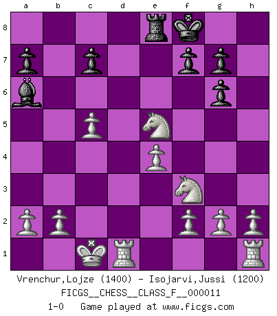 Last move : 1-0 2006 September 22 8:40:17 [Event "FICGS__CHESS__CLASS_F__000011"] [Site "FICGS"] [Date "2006.09.09"] [Round "1"] [White "Vrenchur,Lojze"] [Black "Isojarvi,Jussi"] [Result "1-0"] [WhiteElo "1400"] [BlackElo "1200"] 1.e4 e5 2.Qh5 Nc6 3.Bc4 Qf6 4.c3 Bc5 5.Nf3 d6 6.d4 Nh6 7.dxc5 dxc5 8.Bxh6 O-O 9.Bg5 Qd6 10.Nbd2 Nd4 11.O-O-O b5 12.cxd4 bxc4 13.Nxc4 Qg6 14.Qxg6 hxg6 15.Be7 Ba6 16.Ncxe5 Rae8 17.Bxf8 Kxf8 18.dxc5 1-0 Variation Patzer Opening : Patzer Opening Kingside Castling by player Black (move 8) Queenside Castling by player White (move 11) Player White won this chess game. Follow this game move after move (download)One doesn't have to play well, it's enough to play better than your opponent. (Siegbert Tarrasch) Ich verlor meine Bürgerrechte, mein Gehalt wurde mir nicht mehr bezahlt und ich wurde zensiert und durfte nicht mehr ins Ausland reisen. [nach dem Match Fischer-Taimanov 6:0] (Mark Taimanov) El jugador blanco perdió porque fallo en recordar la coreccta continuación y tuvo que pensar por sí mismo las movidas. (Siegbert Tarrasch) Ne tendez aucun piège pour le plaisir ! Ne jouez rien dans l'espoir que l'adversaire réagisse de façon stupide ! Prenez toujours pour acquis que l'adversaire va trouver le meilleur coup ! Ne jouez jamais de coup dans l'espoir que l'adversaire ne voie pas la menace ! Chacun de vos coups doit améliorer la position d'une façon ou d'une autre. There are three kinds of lies: lies, damned lies and statistics. (Mark Twain)