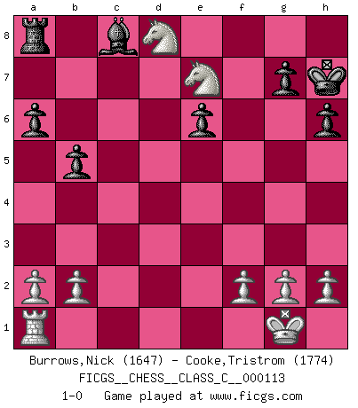 Last move : 1-0 2009 August 15 10:1:50 [Event "FICGS__CHESS__CLASS_C__000113"] [Site "FICGS"] [Date "2009.04.26"] [Round "1"] [White "Burrows,Nick"] [Black "Cooke,Tristrom"] [Result "1-0"] [WhiteElo "1647"] [BlackElo "1774"] 1.e4 e5 2.Nf3 Nc6 3.Bb5 Bc5 4.c3 Nge7 5.O-O a6 6.Bxc6 Nxc6 7.d4 Bd6 8.Be3 exd4 9.cxd4 O-O 10.e5 Be7 11.d5 Na5 12.d6 cxd6 13.exd6 Bf6 14.Nc3 b5 15.Nd5 Nc4 16.Bd4 Bxd4 17.Qxd4 Nxd6 18.Rfe1 Ne8 19.Ne7+ Kh8 20.Qd5 Nc7 21.Qh5 Ne6 22.Rxe6 dxe6 23.Ng5 h6 24.Qxf7 Rxf7 25.Nxf7+ Kh7 26.Nxd8 1-0 Ruy Lopez : Classical defense, 4.c3 Kingside Castling by player White (move 5) Kingside Castling by player Black (move 9) Player White won this chess game. Follow this game move after move (download)Chess is a terrible game. If you have no center, your opponent has a freer position. If you do have a center, then you really have something to worry about ! (Siegbert Tarrasch) Wie ich sie so einen nach dem anderen nieder mähte wurde meine Überlegenheit offensichtlich. (José Raúl Capablanca) Me dio la sensación de como si yo estuviera jugando en contra del mismo Ajedrez. - al estar jugando en contra de Robert Fischer (Walter Shipman) Des points faibles ou des trous dans la position de l'adversaire doivent être occupés par des pièces et non pas par des pions. (Siegbert Tarrasch) They say in chess you've got to kill the queen, and then you mate it... Oh I, do you ? (Red Hot Chili Peppers, Fortune faded)