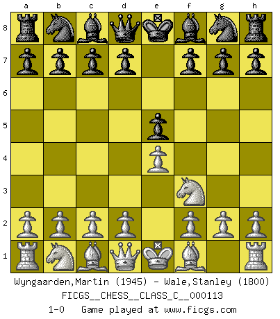 Last move : 1-0 2009 June 5 7:11:32 [Event "FICGS__CHESS__CLASS_C__000113"] [Site "FICGS"] [Date "2009.04.26"] [Round "1"] [White "Wyngaarden,Martin"] [Black "Wale,Stanley"] [Result "1-0"] [WhiteElo "1945"] [BlackElo "1800"] 1.e4 e5 2.Nf3 1-0 This chess game has been lost on time (started : 2009.04.26 3:22:51) King's knight Opening Player White won this chess game. Follow this game move after move (download)I know people who have all the will in the world, but still can't play good Chess. (Bobby Fischer) Ich erzeugte keinen Neid, da mich die Schachspieler als Musiker und die Musiker als Schachspieler betrachteten. (Mark Taimanov) Yo siempre he tenido un ligero sentimiento de lástima por una persona que no tiene conocimiento del Ajedrez. (Siegbert Tarrasch) Les Cavaliers se révèlent fort utiles dans les positions fermées. D'habitude, les Fous sont un peu plus forts que les Cavaliers dans les positions ouvertes. Qu'on le veuille ou non, il restera toujours des exceptions ! Luck has a peculiar habit of favoring those who don't depend on it. (Author unknown)