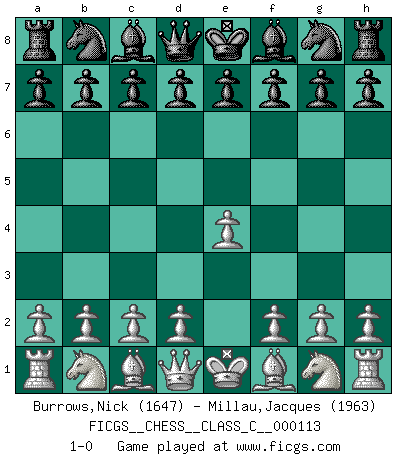 Last move : 1-0 2009 June 25 8:47:28 [Event "FICGS__CHESS__CLASS_C__000113"] [Site "FICGS"] [Date "2009.04.26"] [Round "1"] [White "Burrows,Nick"] [Black "Millau,Jacques"] [Result "1-0"] [WhiteElo "1647"] [BlackElo "1963"] 1.e4 1-0 King's pawn Opening Player White won this chess game. Follow this game move after move (download)The older I grow, the more I value pawns. (Paul Keres) Ich brauche nur einen Blick auf das Schachbrett zu werfen, und weiß schon, was in der Stellung steckt, was geschehen kann und was geschehen wird. Alle übrigen suchen und prüfen, ich aber weiß es! (José Raúl Capablanca) ¿Esta Bobby Fischer algo cuerdo?. (Salo Flohr) Il vaut toujours mieux jouer un plan faux de façon logique que de n'avoir pas de plan du tout. (Victor Kortchnoï) Quotation,n.: The act of repeating erroneously the words of another. The words erroneously repeated. (Ambrose Bierce, The Devil's Dictionary)
