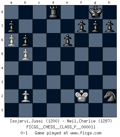 Last move : 0-1 2006 November 23 21:26:35 [Event "FICGS__CHESS__CLASS_F__000011"] [Site "FICGS"] [Date "2006.09.09"] [Round "1"] [White "Isojarvi,Jussi"] [Black "Neil,Charlie"] [Result "0-1"] [WhiteElo "1200"] [BlackElo "1287"] 1.d4 Nf6 2.Bg5 e6 3.Nc3 d5 4.e4 Be7 5.Nf3 dxe4 6.Ne5 Nbd7 7.Bb5 c6 8.Bc4 Nb6 9.Nb5 cxb5 10.Bxb5+ Bd7 11.a4 O-O 12.c4 Bxb5 13.cxb5 Bb4+ 14.Bd2 Qxd4 15.Bxb4 Qxb4+ 16.Qd2 Qxd2+ 17.Kxd2 Rac8 18.a5 Nbd5 19.g4 Rfd8 20.a6 b6 21.Nc6 Rd6 22.Rac1 Nb4 23.Ke2 Nxc6 24.Rhd1 Rxd1 25.Kxd1 Rd8+ 26.Ke1 Ne5 27.Ke2 Nfxg4 28.Rc7 Ra8 29.f3 exf3+ 30.Kd2 Nxh2 31.Ke3 Nd3 32.Rc2 f2 33.Rxf2 Nxf2 34.Kxf2 Rd8 0-1 Trompowsky attack (Ruth, Opovcensky Opening) Kingside Castling by player Black (move 11) Player Black won this chess game. Follow this game move after move (download)We don't really know how the game was invented, though there are suspicions. As soon as we discover the culprits, we'll let you know. (Bruce Pandolfini) Es hat in meinem Leben Zeiten gegeben, da ich sehr nahe daran war zu glauben, daß ich auch nicht eine einzige Schachpartie verlieren könnte. (José Raúl Capablanca) Los libros de Ajedrez deben de usarse igual como usamos los anteojos: para mejorar la vista, aunque algunos jugadores los quieren usar como si ellos les otorgaran la vision. (José Raúl Capablanca) Ce qui est bien, c'est d'avoir tout un tas de pièces en prise : l'adversaire ne peut en prendre qu'une à la fois. Cité par Thierry Audin. Computers make it easier to do a lot of things, but most of the things they make it easier to do don't need to be done. (Andy Rooney)