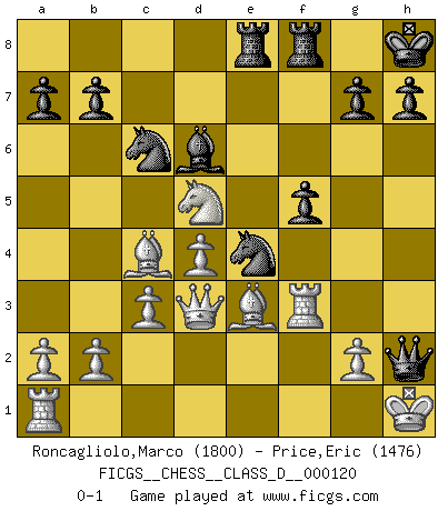 Last move : 0-1 2009 May 12 14:6:2 [Event "FICGS__CHESS__CLASS_D__000120"] [Site "FICGS"] [Date "2009.04.28"] [Round "1"] [White "Roncagliolo,Marco"] [Black "Price,Eric"] [Result "0-1"] [WhiteElo "1800"] [BlackElo "1476"] 1.e4 e5 2.f4 d5 3.exd5 c6 4.Nf3 exf4 5.d4 Bd6 6.dxc6 Nxc6 7.Bd3 Nf6 8.Nc3 Bg4 9.O-O O-O 10.Ne2 Qb6 11.Kh1 Rae8 12.c3 Ne4 13.Nxf4 f5 14.Nd5 Qd8 15.Bc4 Kh8 16.Qd3 Bxf3 17.Rxf3 Qh4 18.Be3 Qxh2+ 0-1 KGD : Nimzovich counter-gambit Kingside Castling by player White (move 9) Kingside Castling by player Black (move 9) Player Black won this chess game. Follow this game move after move (download)My style is somewhere between that of Tal and Petrosian. (Reshevsky) Die Partien sind immer verschieden, die Interviews immer die gleichen. (Garry Kasparov) Cuando tu casa esta en llamas, no puedes ser molestado por tus vecinos. O, como decinos en Ajedrez, si tu Rey esta bajo ataque, no te preocupa perder un Peón del lado de la Reina. (Gary Kasparov) Fischer est le meilleur joueur du monde et Karpov n'est qu'un joueur de bistrot. (Garry Kasparov, agé de 16 ans) Internet: Absolute communication, absolute isolation. (Paul Carvel)