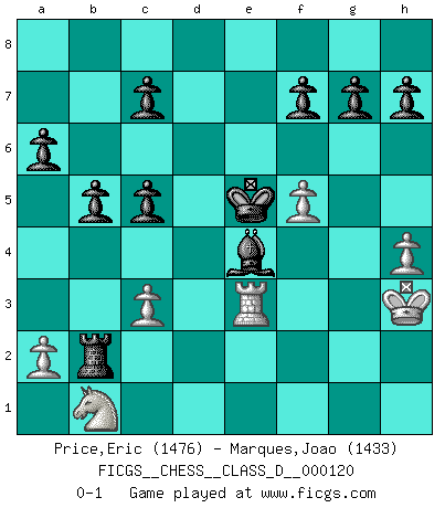 Last move : 0-1 2009 June 2 19:57:58 [Event "FICGS__CHESS__CLASS_D__000120"] [Site "FICGS"] [Date "2009.04.28"] [Round "1"] [White "Price,Eric"] [Black "Marques,Joao"] [Result "0-1"] [WhiteElo "1476"] [BlackElo "1433"] 1.e4 e5 2.Nf3 Nc6 3.Bb5 Nf6 4.O-O a6 5.Bxc6 dxc6 6.Re1 Bd6 7.d4 Nd7 8.dxe5 Nxe5 9.Nxe5 Bxe5 10.Qxd8+ Kxd8 11.f4 Bd4+ 12.Kh1 Ke7 13.c3 Bb6 14.Be3 Bxe3 15.Rxe3 Rd8 16.Na3 b5 17.h3 Rd2 18.Rb1 Bb7 19.Kg1 Rad8 20.Kf1 c5 21.f5 R2d3 22.Ke2 Rd2+ 23.Kf3 Kf6 24.h4 Ke5 25.Kg3 Bxe4 26.Rbe1 R8d3 27.Nb1 Rxg2+ 28.Kh3 Rxe3+ 29.Rxe3 Rxb2 0-1 Ruy Lopez : Berlin defense, 4.O-O Kingside Castling by player White (move 4) Player Black won this chess game. Follow this game move after move (download)In a gambit you give up a Pawn for the sake of getting a lost game. (Samuel Standige Boden) Fischer ist das größte Genie, das je vom Schachhimmel heruntergestiegen ist. (Mikhail Nekhemyevich Tal) Si un gobernante no entiende al Ajedrez, ¿como puede governar él un reinado?. (El Rey Khusros II) Aux échecs, les retours au sommet sont rares : les dommages psychologiques consécutifs à une défaite sont trop sévères. (Daily Telegraph) When you don't know what to do, walk fast and look worried. (Anonymous)