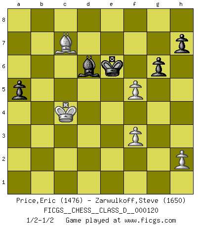 Last move : 1/2-1/2 2009 June 3 17:55:41 [Event "FICGS__CHESS__CLASS_D__000120"] [Site "FICGS"] [Date "2009.04.28"] [Round "1"] [White "Price,Eric"] [Black "Zarwulkoff,Steve"] [Result "1/2-1/2"] [WhiteElo "1476"] [BlackElo "1650"] 1.e4 c5 2.Nf3 Nc6 3.d4 cxd4 4.Nxd4 g6 5.Nc3 Bg7 6.Be3 Nf6 7.f3 O-O 8.Qd2 d5 9.exd5 Nxd5 10.Nxc6 bxc6 11.Nxd5 cxd5 12.c3 e5 13.Bb5 d4 14.cxd4 exd4 15.Bg5 Qb6 16.a4 a6 17.Bd3 Re8+ 18.Kf2 Rb8 19.Rab1 Bf5 20.Bf4 Bxd3 21.Qxd3 Rbc8 22.Rhe1 Rxe1 23.Kxe1 Qb4+ 24.Kf2 Qxa4 25.Bd6 Qc2+ 26.Qxc2 Rxc2+ 27.Kf1 d3 28.Rd1 Bxb2 29.Rxd3 Rc8 30.Ke2 Bc3 31.Be7 a5 32.Rd8+ Rxd8 33.Bxd8 f5 34.Kd3 Bb4 35.Kc4 Kf7 36.g4 Ke6 37.Bc7 Bd6 38.gxf5+ 1/2-1/2 Sicilian : Accelerated Fianchetto, Modern variation Kingside Castling by player Black (move 7) 10 pieces endgame at move 38 : White KBPPP , Black KBPPP WHITE : King + 1 Bishop 3 Pawns BLACK : King + 1 Bishop 3 Pawns This chess game ended in a draw. Follow this game move after move (download)Chess is like life. (Boris Spassky) Karpov ist ein Museumsstück. (Garry Kasparov) Una victoria por una combinación errónea, aunque sea espectacular, me llena de horror artístico. (Wilhelm Steinitz) La tactique, c'est ce que vous faites quand il y a quelque chose à faire; la stratégie, c'est ce que vous faites quand il n'y a rien à faire. (Savielli Tartacower) Every now and then a man's mind is stretched by a new idea and never shrinks back to its former dimensions. (Oliver Wendell Holmes, Sr.)