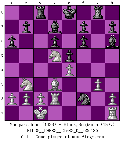 Last move : 0-1 2009 May 29 22:4:16 [Event "FICGS__CHESS__CLASS_D__000120"] [Site "FICGS"] [Date "2009.04.28"] [Round "1"] [White "Marques,Joao"] [Black "Block,Benjamin"] [Result "0-1"] [WhiteElo "1433"] [BlackElo "1577"] 1.e4 c5 2.Nf3 d6 3.d4 cxd4 4.Nxd4 Nf6 5.Nc3 a6 6.Bg5 e6 7.Qf3 Bd7 8.Bxf6 Qxf6 9.Qxf6 gxf6 10.Bd3 Nc6 11.Nf3 Rg8 12.g3 Rc8 13.O-O-O Ne5 14.Nd4 Ng4 15.Rd2 e5 16.Nb3 Bh6 17.Nd5 Nxf2 0-1 Sicilian : Najdorf, 6...e6 Queenside Castling by player White (move 13) Player Black won this chess game. Follow this game move after move (download)The winner of the game is the player who makes the next-to-last mistake. (Savielly Tartakover) In der Schule lernt man nichts. Es ist nur Zeitverschwendung. (Robert James Fischer) Cuando le juegas a Fischer, no es una cuestion de si vas a ganar o perder. Es una cuestion de si vas a sobrevivir. (Boris Spassky) Même un GMI sait rarement calculer sur plus de cinq coups une attaque à sacrifices. (Rudolf Spielmann) Real knowledge is to know the extent of one's ignorance. (Confucius)