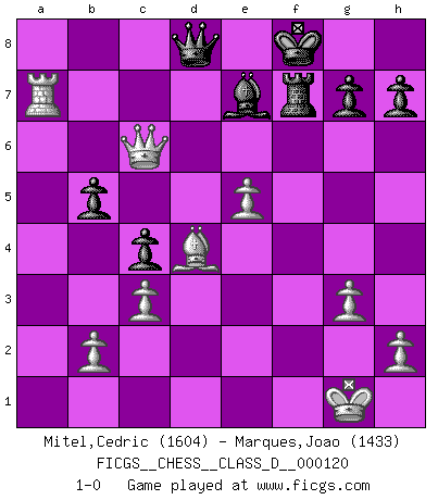 Last move : 1-0 2009 July 21 12:59:47 [Event "FICGS__CHESS__CLASS_D__000120"] [Site "FICGS"] [Date "2009.04.28"] [Round "1"] [White "Mitel,Cedric"] [Black "Marques,Joao"] [Result "1-0"] [WhiteElo "1604"] [BlackElo "1433"] 1.f4 d5 2.Nf3 e6 3.g3 Nf6 4.Bg2 Be7 5.O-O O-O 6.d3 c5 7.c3 Nc6 8.a4 Bd7 9.Na3 a6 10.Qc2 Rc8 11.e4 dxe4 12.dxe4 Na5 13.Ne5 Be8 14.Nac4 Nxc4 15.Nxc4 b5 16.Ne3 Bc6 17.e5 Nd5 18.axb5 axb5 19.Nxd5 Bxd5 20.Be3 Bxg2 21.Qxg2 c4 22.Rfd1 Qe8 23.Ra7 Rd8 24.Rxd8 Qxd8 25.Bd4 f6 26.Qc6 fxe5 27.Qxe6+ Rf7 28.fxe5 Kf8 29.Qc6 1-0 Bird's Opening Kingside Castling by player White (move 5) Kingside Castling by player Black (move 5) Player White won this chess game. Follow this game move after move (download)When in doubt... play Chess ! (Tevis) Zu meiner Zeit war ein 20 jähriger ein junger Spieler, heute ist er ein Veteran. (Garry Kasparov) El Ajedrez, como cualquier otra actividad creativa, puede existir solo a través de méritos combinados de aquellos que tienen talento creativo y de aquellos que tienen la habilidad de organizar un trabajo creativo. (Mikhail Botvinnik) On croit qu'il y a plus de mauvais joueurs que de bons joueurs, c'est faux : Il y a autant de joueurs qui gagnent que de joueurs qui perdent. (Philippe Geluck) Opportunities multiply as they are seized. (Sun Tzu)