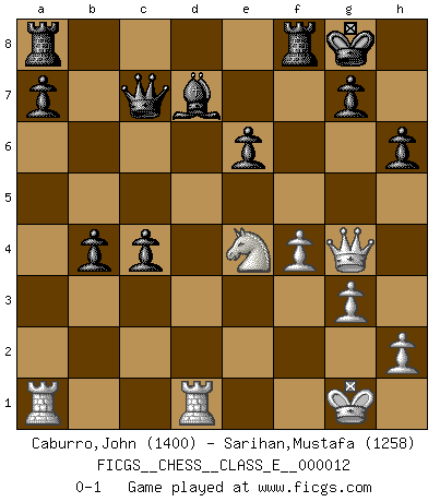 Last move : 0-1 2006 December 27 12:35:54 [Event "FICGS__CHESS__CLASS_E__000012"] [Site "FICGS"] [Date "2006.09.10"] [Round "1"] [White "Caburro,John"] [Black "Sarihan,Mustafa"] [Result "0-1"] [WhiteElo "1400"] [BlackElo "1258"] 1.Nf3 d5 2.d4 c6 3.c4 dxc4 4.e4 b5 5.a4 Bg4 6.axb5 cxb5 7.Nc3 Bd7 8.Bf4 e6 9.d5 Nf6 10.dxe6 fxe6 11.Be2 Bb4 12.O-O Bxc3 13.bxc3 O-O 14.Bd6 Re8 15.e5 Ne4 16.Bxb8 Nxc3 17.Qc2 Nxe2+ 18.Qxe2 Qxb8 19.Rfd1 Qc7 20.Ng5 h6 21.Ne4 Qxe5 22.f4 Qc7 23.Qg4 Rf8 24.g3 b4 0-1 Reti Opening Kingside Castling by player White (move 12) Kingside Castling by player Black (move 13) Player Black won this chess game. Follow this game move after move (download)When your house is on fire, you can't be bothered with the neighbors. Or, as we say in Chess, if your King is under attack you don't worry about losing a Pawn on the Queen's side. (Gary Kasparov) Wenn du auf das Glück wartest, wird das Leben ziemlich langweilig. (Mikhail Nekhemyevich Tal) El Ajedrez es un mar en el cual un mosquito puede beber y un elefante puede bañarse. (Refrán Hindú) Toute estimation doit être constamment réévaluée. (Jacob Estrin) There are two types of people in this world, good and bad. The good sleep better, but the bad seem to enjoy the waking hours much more. (Woody Allen)