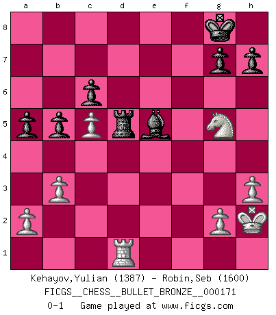 Last move : 0-1 2010 February 6 21:16:7 [Event "FICGS__CHESS__BULLET_BRONZE__000171"] [Site "FICGS"] [Date "2010.02.06"] [Round "1"] [White "Kehayov,Yulian"] [Black "Robin,Seb"] [Result "0-1"] [WhiteElo "1387"] [BlackElo "1600"] 1.d4 e6 2.e4 d5 3.exd5 exd5 4.Nf3 Bd6 5.Be3 Ne7 6.Nc3 c6 7.Bd3 Bg4 8.O-O Nd7 9.h3 Bh5 10.Be2 Bg6 11.Na4 O-O 12.c4 dxc4 13.Bxc4 b5 14.Bxf7+ Bxf7 15.Nc5 Nxc5 16.dxc5 Bc7 17.Qxd8 Rfxd8 18.b3 Nd5 19.Rad1 Nxe3 20.Rxd8+ Rxd8 21.fxe3 a5 22.Ng5 Bd5 23.e4 Be5 24.exd5 Bd4+ 25.Kh2 Rxd5 26.Rd1 Be5+ 0-1 Queen's pawn Kingside Castling by player White (move 8) Kingside Castling by player Black (move 11) Player Black won this chess game. Follow this game move after move (download)Chess is a part of culture and if a culture is declining then Chess too will decline. (Mikhail Botvinnik) Ihnen, Herr Lasker, habe ich nur drei Worte zu sagen: Schach und matt. (Siegbert Tarrasch) El sobresalir en el Ajedrez es un signo de una mente intrigante. (Sir Arthur Conan Doyle) Les échecs sont utiles à l'exercice de la faculté de penser et à celle de l'imagination. Car nous devons posséder une méthode élaborée pour atteindre des buts partout où nous devons conduire notre raison. (Leibnitz) Big Chess is a place for big hallucinations. (Thibault de Vassal)