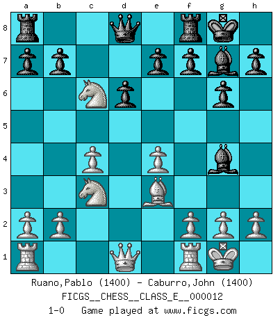 Last move : 1-0 2006 October 6 0:17:56 [Event "FICGS__CHESS__CLASS_E__000012"] [Site "FICGS"] [Date "2006.09.10"] [Round "1"] [White "Ruano,Pablo"] [Black "Caburro,John"] [Result "1-0"] [WhiteElo "1400"] [BlackElo "1400"] 1.e4 g6 2.d4 Bg7 3.Nf3 c5 4.c4 cxd4 5.Nxd4 Nc6 6.Be3 Nf6 7.Nc3 O-O 8.Be2 d6 9.O-O Ng4 10.Bxg4 Bxg4 11.Nxc6 1-0 Robatsch (Modern) defense Kingside Castling by player Black (move 7) Kingside Castling by player White (move 9) Player White won this chess game. Follow this game move after move (download)First-class players lose to second-class players because second-class players sometimes play a first-class game. (Siegbert Tarrasch) Schach ist ein schwarz-weisser Dschungel. (Garry Kasparov) Desconfianza es la característica mas necesaria de un jugador de Ajedrez. (Siegbert Tarrasch) Ce n'est pas pour s'amuser qu'il joue aux échecs : il célèbre un culte. (Vladimir Nabokov) When the going gets tactical, the computers get going. (Hyatt)