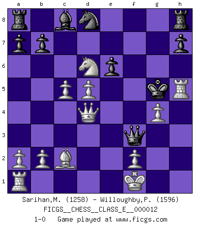 Last move : 1-0 2006 December 29 22:14:49 [Event "FICGS__CHESS__CLASS_E__000012"] [Site "FICGS"] [Date "2006.09.10"] [Round "1"] [White "Sarihan,Mustafa"] [Black "Willoughby,Peter"] [Result "1-0"] [WhiteElo "1258"] [BlackElo "1596"] 1.e4 e6 2.d4 d5 3.Nc3 Nf6 4.Bg5 Be7 5.e5 Nfd7 6.Bxe7 Qxe7 7.Nf3 c5 8.Nb5 Nb6 9.Nd6+ Kf8 10.dxc5 Nc4 11.Bxc4 Nc6 12.Bb3 g6 13.c4 Kg7 14.cxd5 Nd8 15.Kf1 f6 16.exf6+ Qxf6 17.Ne4 Qf8 18.Qd4+ Kh6 19.g4 g5 20.h4 Kg6 21.Nd6 Qxf3 22.Bc2+ Kh6 23.hxg5+ Kxg5 24.Rh5+ 1-0 French : Classical variation Player White won this chess game. Follow this game move after move (download)Fischer sacrificed virtually everything most of us weakies (to use his term) value, respect, and cherish, for the sake of an artful, often beautiful board game, for the ambivalent privilege of being its greatest master. (Paul Kollar) Mit sehr nachdenklichem Gesicht schreitet Bobby durch den Turniersaal. Was ist passiert?, fragt Lombardy. Ich stehe schlecht, antwortet Fischer. Lombardy: Dann biete doch einfach Remis an. Fischer: So schlecht stehe ich nun auch wieder nicht! (Robert James Fischer) Un sacrificio se refuta mucho mejor al aceptarlo. (Wilhelm Steinitz) Le jeu d'échecs fait naître et fortifie en nous plusieurs qualités précieuses dans le cours de l'existence, telles que la prévoyance, la circonspection, la prudence, et la persévérance. (Benjamin Franklin - 1783, la morale des échecs) In every real man a child is hidden that wants to play. (Friedrich Nietzsche)