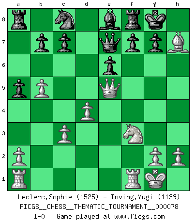 Last move : 1-0 2009 June 26 18:14:30 [Event "FICGS__CHESS__THEMATIC_TOURNAMENT__000078"] [Site "FICGS"] [Date "2009.04.29"] [Round "1"] [White "Leclerc,Sophie"] [Black "Inving,Yugi"] [Result "1-0"] [WhiteElo "1525"] [BlackElo "1139"] 1.d4 d5 2.e4 dxe4 3.Nc3 Nf6 4.f3 exf3 5.Nxf3 e6 6.Bc4 Bd6 7.O-O Nc6 8.Bg5 O-O 9.Ne4 Be7 10.Nxf6+ Bxf6 11.Bxf6 Qxf6 12.c3 Bd7 13.Qe2 Qe7 14.b4 a5 15.b5 Na7 16.Bd3 Nc8 17.Qe5 Be8 18.Bxh7+ 1-0 Blackmar gambit Kingside Castling by player White (move 7) Kingside Castling by player Black (move 8) Player White won this chess game. Follow this game move after move (download)Chess teaches you to control the initial excitement you feel when you see something that looks good and it trains you to think objectively when you're in trouble. (Stanley Kubrick) Um sich vor der Gefahr einer Erkältung zu schützen, sorge der wanderlustige König beizeiten für ein brauchbares Versteck. (Aaron Nimzowitsch) Solo el jugador con la iniciativa tiene el derecho a atacar. (Wilhelm Steinitz) La menace est plus forte que l'exécution. (Aaron Nimzovitch) Macintosh - we might not get everything right, but at least we knew the century was going to end. (Douglas Adams)