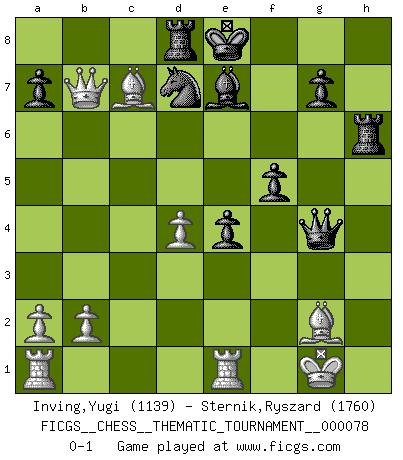 Last move : 0-1 2009 June 18 21:1:36 [Event "FICGS__CHESS__THEMATIC_TOURNAMENT__000078"] [Site "FICGS"] [Date "2009.04.29"] [Round "1"] [White "Inving,Yugi"] [Black "Sternik,Ryszard"] [Result "0-1"] [WhiteElo "1139"] [BlackElo "1760"] 1.d4 d5 2.e4 dxe4 3.Nc3 Nf6 4.f3 exf3 5.Nxf3 Bg4 6.h3 Bh5 7.g4 Bg6 8.Ne5 c6 9.Bg2 e6 10.Bf4 Nd5 11.Nxd5 Qh4+ 12.Ke2 exd5 13.Re1 Be7 14.Nf3 Qf6 15.Be5 Qe6 16.Kf1 Be4 17.Nd2 f5 18.Kg1 Qg6 19.c4 Nd7 20.Bg3 h5 21.cxd5 cxd5 22.Qb3 hxg4 23.Nxe4 dxe4 24.Qxb7 Rd8 25.hxg4 Qxg4 26.Bc7 Rh6 0-1 Blackmar gambit Player Black won this chess game. Follow this game move after move (download)There just isn't enough televised Chess. (David Letterman) Der 70jährige Viktor Kortschnoi: Die Rentenanstalt wollte mich zwingen in Rente zu gehen. Meine Frau erhält jetzt eine Pension- und ich zahle weiter in die Rentenkasse ein! (Viktor Kortschnoi) No es suficiente ser un buen jugador, se debe también de jugar bién. (Siegbert Tarrasch) Demandez au pauvre Cg1 ce qu'il en pense. Eduard Gufeld à propos de la variante Saemisch de l'Est-Indienne. Every now and then a man's mind is stretched by a new idea and never shrinks back to its former dimensions. (Oliver Wendell Holmes, Sr.)