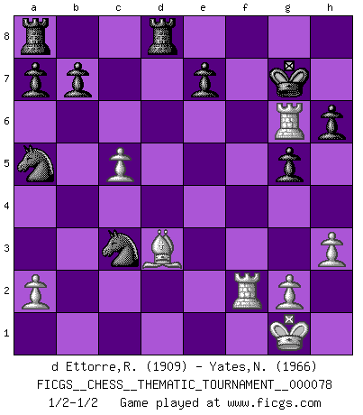 Last move : 1/2-1/2 2009 June 5 13:8:49 [Event "FICGS__CHESS__THEMATIC_TOURNAMENT__000078"] [Site "FICGS"] [Date "2009.04.29"] [Round "1"] [White "d Ettorre,Rodolfo"] [Black "Yates,Normajean"] [Result "1/2-1/2"] [WhiteElo "1909"] [BlackElo "1966"] 1.d4 d5 2.e4 dxe4 3.Nc3 Nf6 4.f3 exf3 5.Nxf3 g6 6.Bc4 Bg7 7.O-O O-O 8.Qe1 Nc6 9.Qh4 Bf5 10.h3 Bxc2 11.Rf2 Bf5 12.Bh6 Qd6 13.Rd1 Na5 14.Bf1 Rfd8 15.Bxg7 Kxg7 16.d5 h6 17.b4 g5 18.Qd4 c5 19.bxc5 Qf4 20.Bd3 Qxd4 21.Nxd4 Be6 22.Nxe6+ fxe6 23.Re1 Nxd5 24.Rxe6 Nxc3 25.Rg6+ 1/2-1/2 Blackmar gambit Kingside Castling by player White (move 7) Kingside Castling by player Black (move 7) This chess game ended in a draw. Follow this game move after move (download)Do you realize Fischer almost never has any bad pieces? He exchanges them, and the bad pieces remain with his opponents. (Yuri Balashov) Das Schach ist nichts für kleine Geister, es beansprucht einen vollen Mann, der sich nicht sklavisch an das Überlieferte hält, sondern selbständig die Tiefen des Spiels zu ergründen sucht. (Wilhelm Steinitz) Evita las multitudes. Haz independientemente tu propio razonamiento. Trata de ser el jugador de Ajedrez, no la pieza de Ajedrez. (Ralph Charell) Lorsque vous vous retrouvez devant une position atroce, ne tendez pas un ultime piège dérisoire avec l'intention d'abandonner si l'adversaire le déjoue ! Faites-vous plutôt un devoir de résister comme si votre vie en dépendait. Jouez le coup qui vous déplairait au centuple si vous étiez dans la peau de votre tortionnaire ! Unless I accept my faults I will most certainly doubt my virtues. (Hugh Prather)