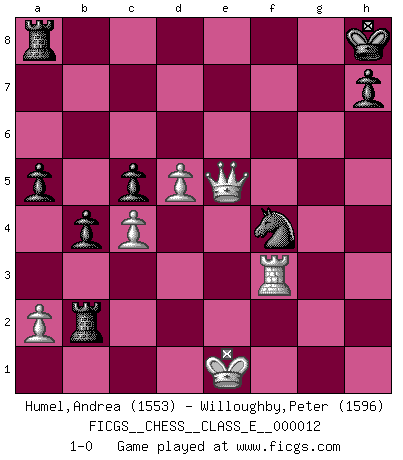 Last move : 1-0 2006 October 19 17:20:33 [Event "FICGS__CHESS__CLASS_E__000012"] [Site "FICGS"] [Date "2006.09.10"] [Round "1"] [White "Humel,Andrea"] [Black "Willoughby,Peter"] [Result "1-0"] [WhiteElo "1553"] [BlackElo "1596"] 1.d4 Nf6 2.c4 c5 3.d5 b5 4.Bg5 b4 5.Bxf6 exf6 6.e4 Bd6 7.Qg4 O-O 8.h4 Be5 9.Qe2 d6 10.Nf3 a5 11.Nxe5 fxe5 12.Nd2 Nd7 13.g4 Nf6 14.g5 Ne8 15.Bh3 f6 16.O-O-O Bxh3 17.Rxh3 fxg5 18.Qh5 Nf6 19.Qxg5 Nd7 20.Rdh1 Rxf2 21.Qg3 Rf7 22.Nf3 Nf6 23.Ng5 Rfa7 24.Ne6 Qe7 25.h5 Nxe4 26.Qe3 Nf6 27.Rg1 Kh8 28.Rxg7 Qxg7 29.Nxg7 Rxg7 30.Rf3 Nxh5 31.Qh6 Nf4 32.Qxd6 Rg1+ 33.Kd2 Rg2+ 34.Ke1 Rxb2 35.Qxe5+ 1-0 Benko gambit Kingside Castling by player Black (move 7) Queenside Castling by player White (move 16) Player White won this chess game. Follow this game move after move (download)When asked, -How is that you pick better moves than your opponents?, I responded: I'm very glad you asked me that, because, as it happens, there is a very simple answer. I think up my own moves, and I make my opponent think up his. (Alexander Alekhine) Es ist schade, dass viele Schachsportler vergessen, wie wichtig Auftreten und angemessene Kleidung sind. (Alexandra Kosteniuk) Tu eres para mi la Reina en d8 y yo soy el Peón en d7!!. (GM Eduard Gufeld) Vous n'êtes pas toujours obligé de jouer le meilleur coup. Un coup doit être actif, entreprenant, correct et beau ! (David Bronstein) I live to kill Traxler counterattack. (Ilmars Cirulis)