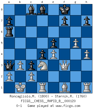 Last move : 0-1 2009 May 8 21:12:10 [Event "FICGS__CHESS__RAPID_B__000120"] [Site "FICGS"] [Date "2009.04.29"] [Round "1"] [White "Roncagliolo,Marco"] [Black "Sternik,Ryszard"] [Result "0-1"] [WhiteElo "1800"] [BlackElo "1760"] 1.e4 c5 2.Nf3 Nc6 3.d4 cxd4 4.Nxd4 Nf6 5.Nc3 d6 6.Bg5 e6 7.f4 Be7 8.Nxc6 bxc6 9.Qf3 Rb8 10.O-O-O Qb6 11.b3 e5 12.h3 Qb4 13.Bxf6 Bxf6 14.f5 O-O 15.h4 d5 16.g4 Qa3+ 17.Kb1 d4 18.Ne2 c5 19.g5 Bd8 20.f6 c4 21.Nc1 c3 22.Nd3 Rb6 23.fxg7 Ra6 24.gxf8Q+ Kxf8 0-1 Sicilian defense Queenside Castling by player White (move 10) Kingside Castling by player Black (move 14) Promotion Queen by player White (move 24) Player Black won this chess game. Follow this game move after move (download)I feel as if I were a piece in a game of Chess, when my opponent says of it: That piece cannot be moved. (Soren Kierkegaard) Je mehr ich von der FIDE weiss, um so weniger verstehe ich. (Alexander Kalifman) Mi estilo es algo parecido entre un poco de Tal y Petrosian. (Reshevsky) À la honte des hommes, on sait que les lois du jeu sont les seules qui soient partout justes, claires, inviolables et exécutées. Pourquoi l'Indien qui a donné les règles du jeu d'échecs est-il obéi de bon gré dans toute la terre, et que les décrétales des papes, par exemple, sont aujourd'hui un objet d'horreur et de mépris ? C'est que l'inventeur des échecs combina tout avec justesse pour la satisfaction des joueurs, et que les papes, dans leurs décrétales, n'eurent en vue que leur seul avantage. L'Indien voulut exercer également l'esprit des hommes et leur donner du plaisir; les papes ont voulu abrutir l'esprit des hommes. Voltaire (Dictionnaire philosophique / Garnier 1967) Warrior pose battles inner weakness and wins focus. You see that there is no war within you. You're on your own side, and you are your own strength. (Terri Guillemets)